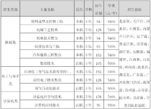 学校除招收高中毕业生外,根据教育部、人力资源和社会保障部有关文件规定,采取单独命题、考试、录取的办法,从中等职业学校(含职业高中、中等专业学校、技工院校)优秀毕业生中招生,为职业教育培养“双证书、一体化”职教师资。单独招生录取的学生与全国普通高考录取的学生享受同等待遇。