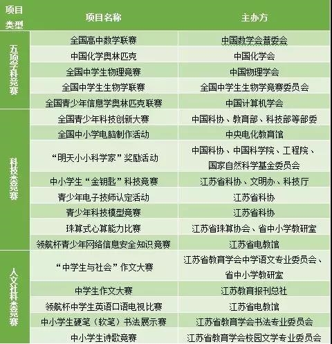 (一)竞赛类:高中阶段参加全国中学生五项学科竞赛(数学、化学、物理、生物、信息),或者科技类、人文社科类竞赛(竞赛项目详见附件1)获得省级赛区三等奖及以上(独立参赛或排名第一);