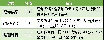 入选考生须参加全国统一高考,两门选测科目等级必须达到BB及以上、必测科目4C1合格。我校根据考生的高考成绩、学校考评分、选测科目等维度进行多元加权综合评价,形成综合评价分(满分960分),评价方法如下: