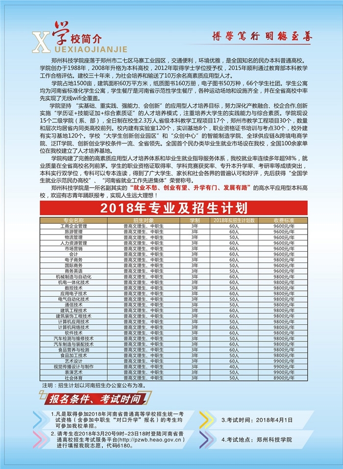 郑州科技学院2018年单招招生简章
