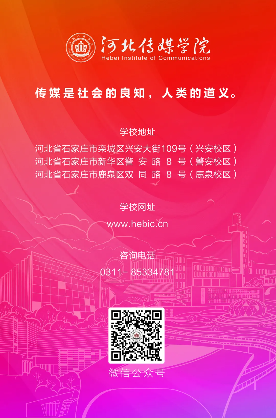 河北传媒学院是一所以传媒艺术为主,艺、文、工、管、教等多学科兼容的民办全日制普通高等学校。学校始建于2000年,2011年获得专业硕士研究生招生资格,2013年开始与中国艺术研究院联合培养博士研究生。2021年正式获批为硕士学位授予单位,戏剧与影视硕士、新闻与传播硕士增列为学位授权点。
