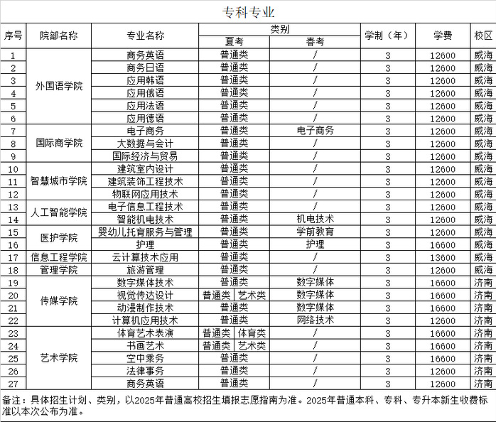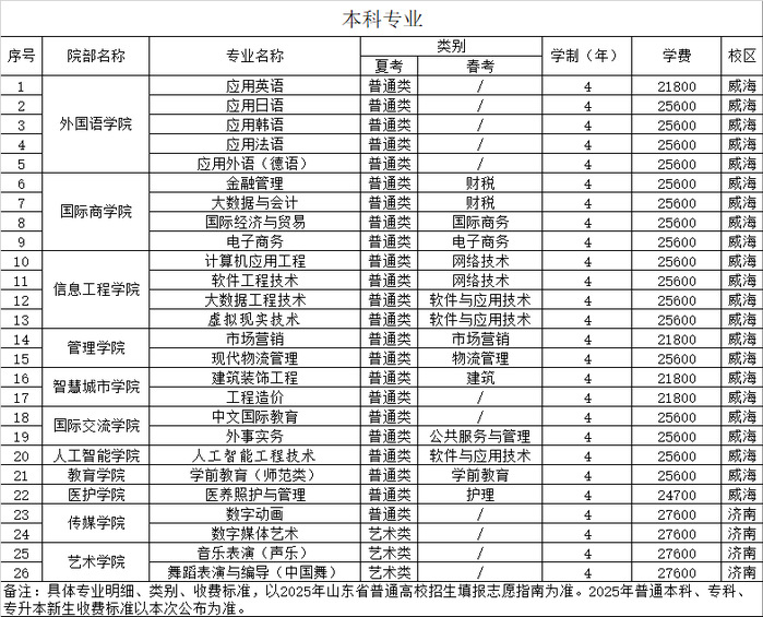 目前,学校设威海和济南两个校区,主校区坐落在国家4A级旅游度假区乳山银滩,占地总面积3113亩,建筑总面积85.8万平方米。设有外国语学院、国际交流学院、国际商学院、管理学院、信息工程学院、人工智能学院、智慧城市学院、医护学院、传媒学院、艺术学院、教育学院、马克思主义学院、继续教育学院、创新创业学院、武术学院、体育部等16个教学院部,开设67个本、专科专业,形成了文、经、工、管等多学科协调发展、专业群与产业链无缝对接的发展格局。