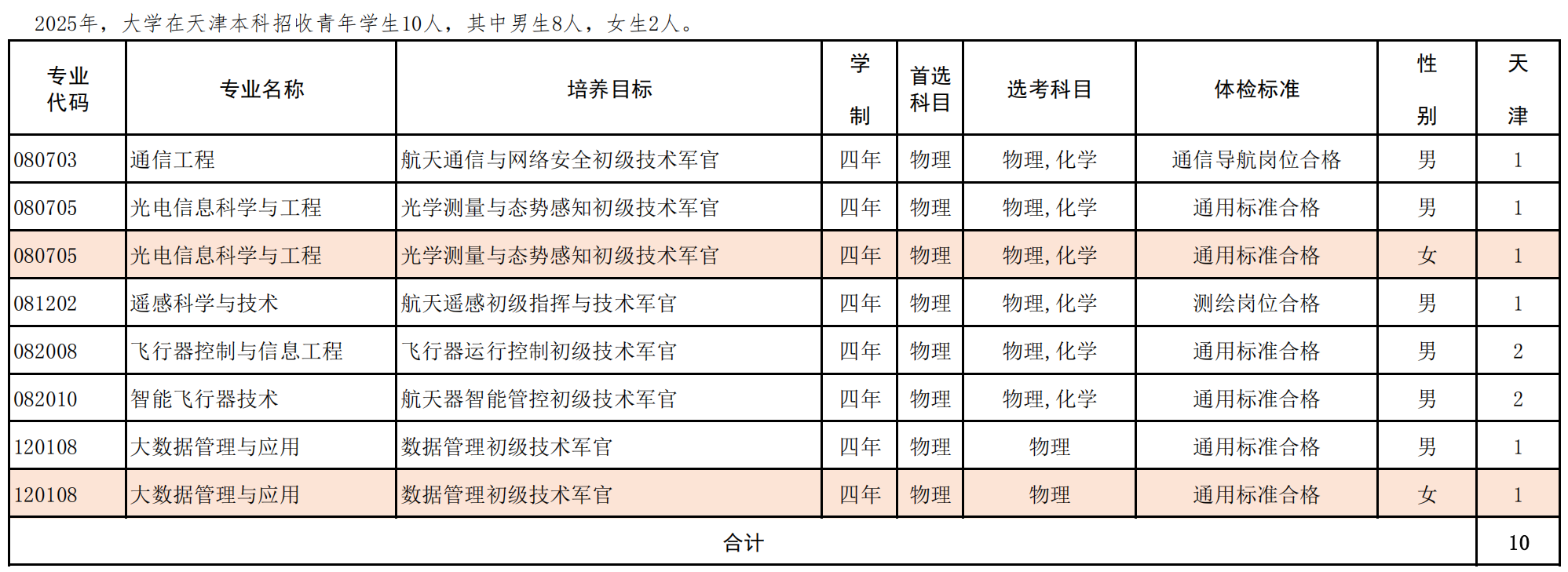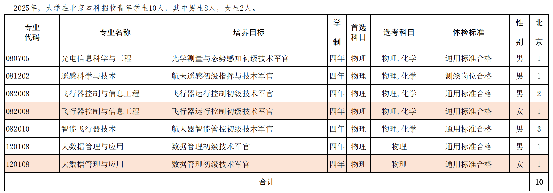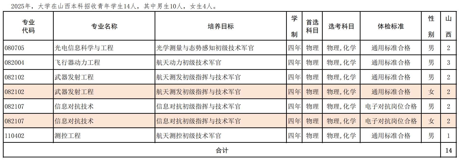 2025年,大学面向北京、天津、河北、山西、内蒙古、辽宁、吉林、黑龙江、江苏、浙江、安徽、福建、江西、山东、河南、湖北、湖南、广东、广西、海南、重庆、四川、陕西、甘肃、新疆25个省市(自治区)共计招收青年学生376人,其中男生279人、女生97人。培养目标为指挥与技术军官的专业,入校后进行融合式培养。