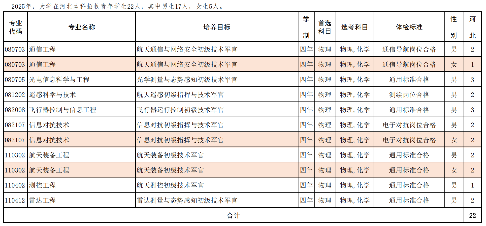 专业与体检标准对应关系:①通信导航岗位合格:通信工程。②测绘岗位合格:遥感科学与技术。③电子对抗岗位合格:信息对抗技术。④通用标准:其余所有专业。