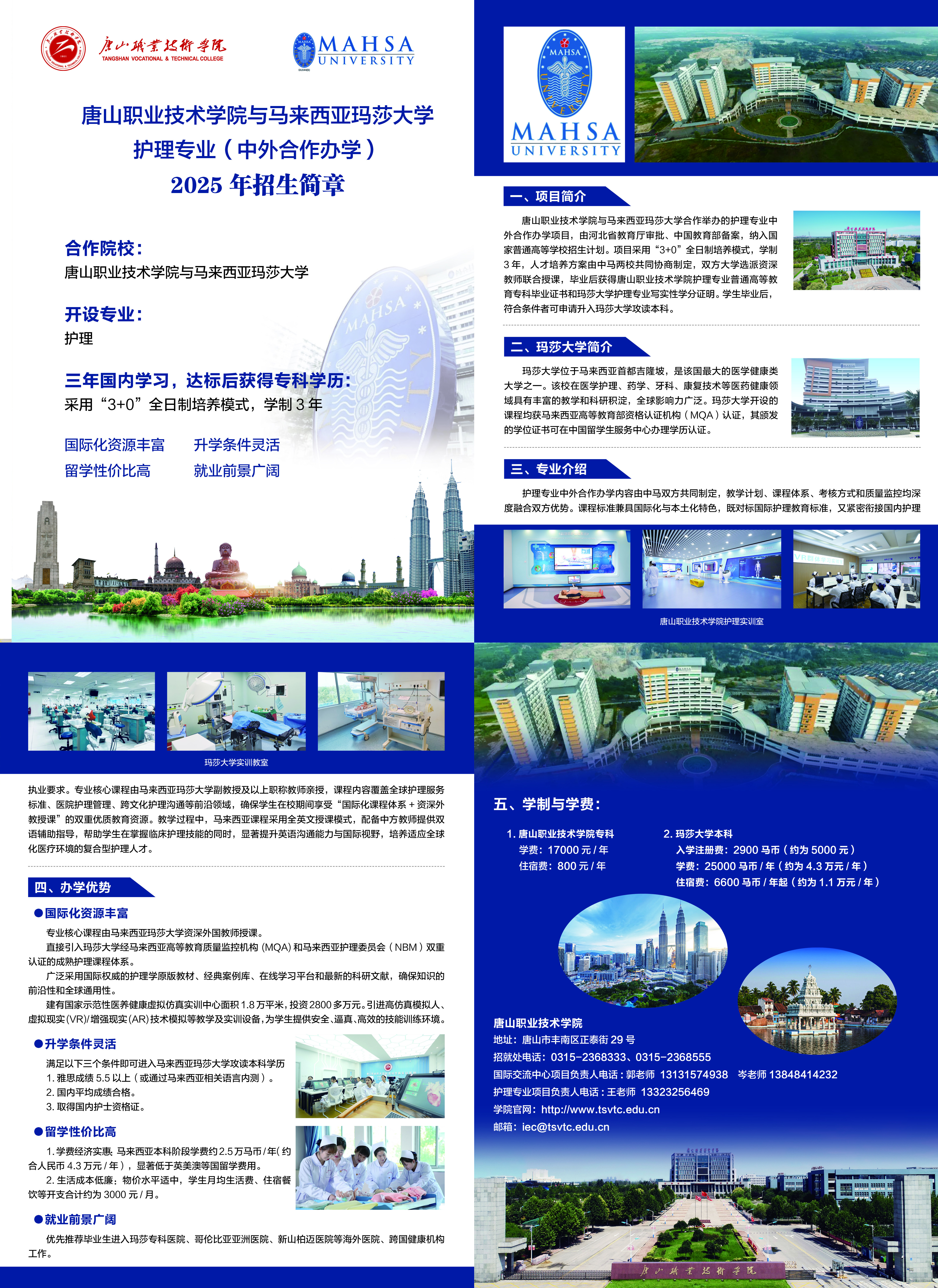 唐山职业技术学院与马来西亚玛莎大学护理专业(中外合作办学)2025 年招生简章