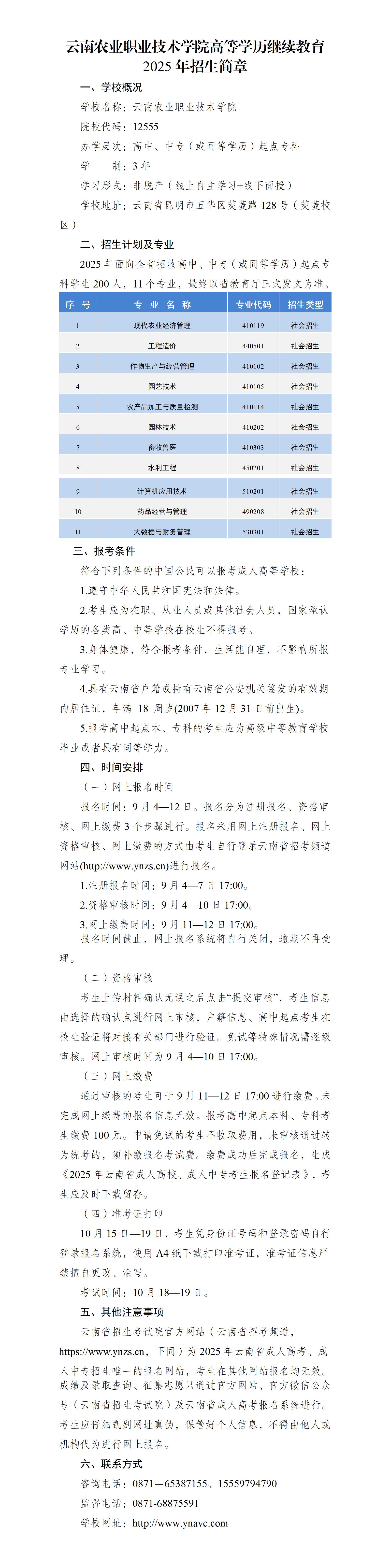 云南农业职业技术学院高等学历继续教育2025年招生简章