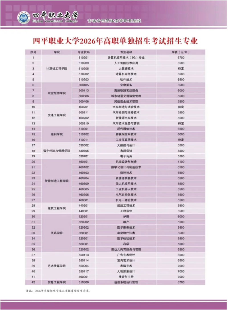 四平职业大学2026年单独招生简章