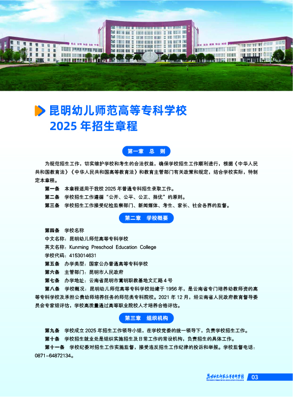1、昆明幼儿师范高等专科学校2025年招生章程