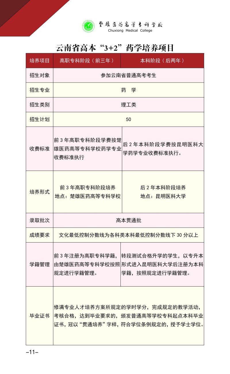 7、楚雄医药高等专科学校招生章程