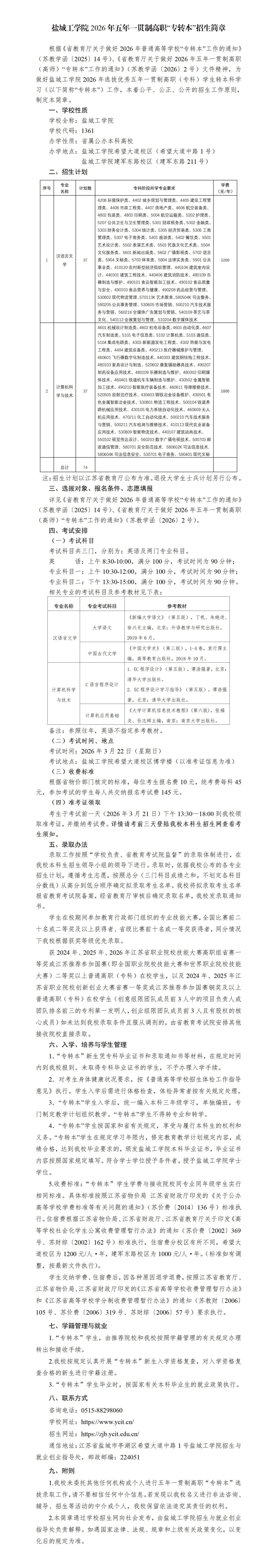 【2026年】盐城工学院五年一贯制高职“专转本”招生简章