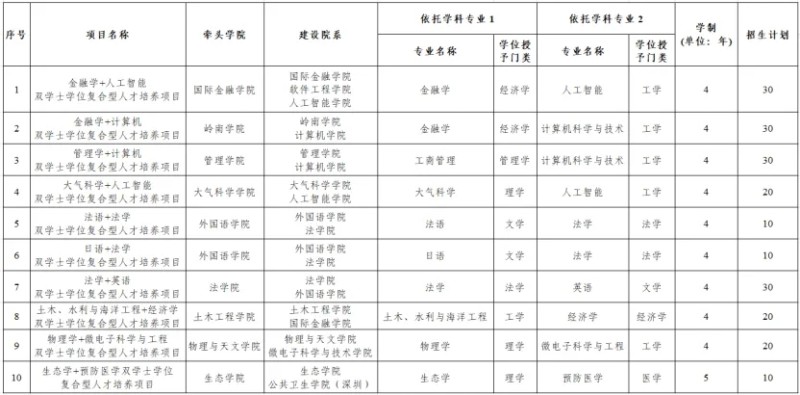 中山大学拟重点建设发展4个类别的双学位项目,2025年共10个项目招生。主要涉及4大领域:第一是“X+人工智能”,如金融学+人工智能、金融学+计算机、管理学+计算机、大气科学+人工智能;第二是“涉外人才类”,如法语+法学、日语+法学、法学+英语;第三是“生命健康类”,生态学+预防医学;第四是“湾区战略类”,如土木、水利与海洋工程+经济学,物理学+微电子科学与工程。