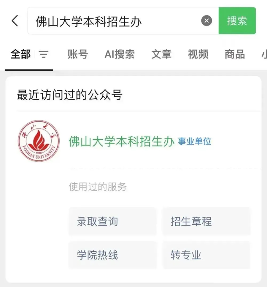 在手机微信搜索:佛山大学本科招生办,进入公众号