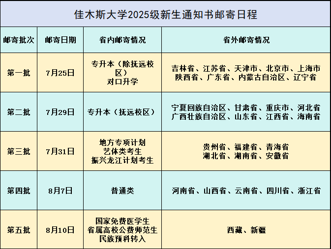 佳木斯大学2025级新生通知书邮寄日程