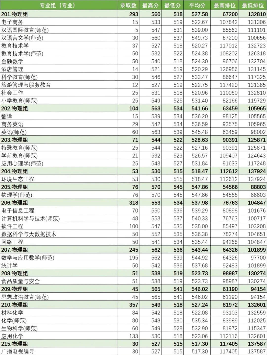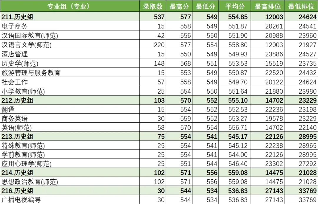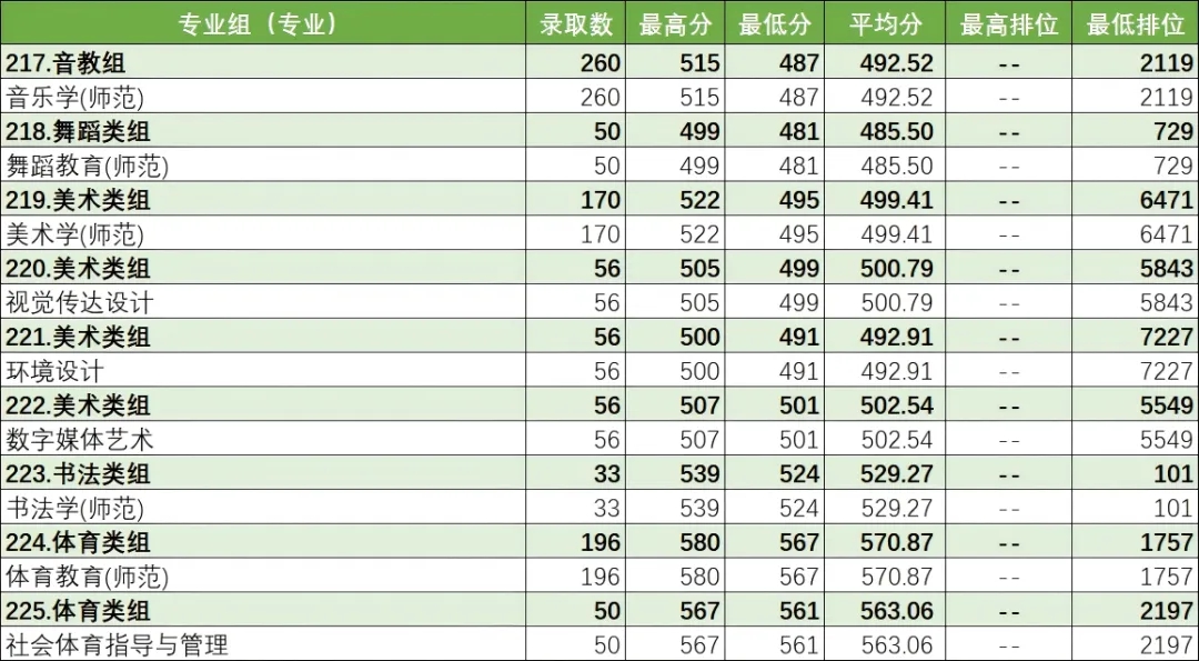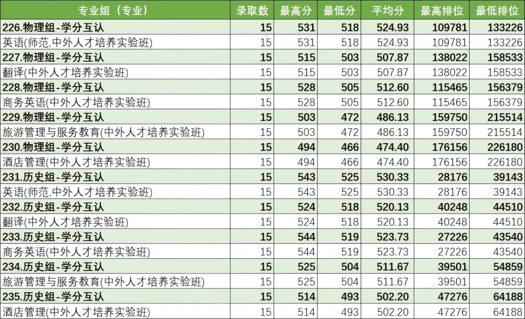小学教育专业(历史组)最低分数550,排位23980;小学教育(物理组)最低分数525,排位119729,起点高,势头强劲。舞蹈教育专业最低录取分数481,排位729名,首年招生即展现良好吸引力。(以上统计不含中外学分互认项目)