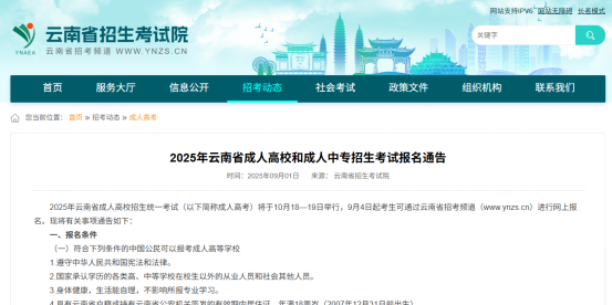 《2025年云南省成人高校和成人中专招生考试报名通告》已发布,现将通告转发如下,请各位考生务必按时报名,切勿错过时间!