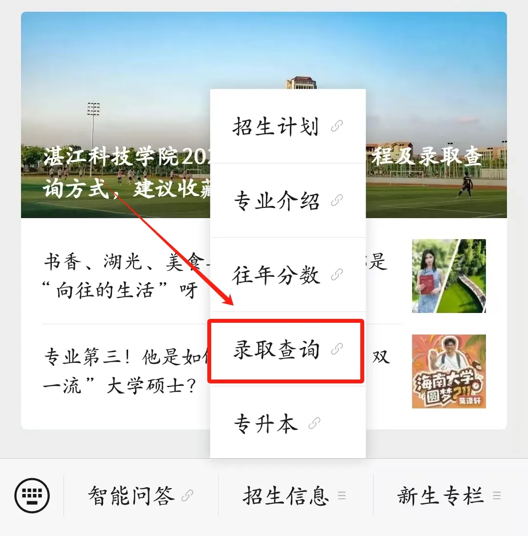 关注“湛江科技学院招生办”微信公众号点击菜单栏中招生信息-录取查询栏目输入信息查询录取结果。