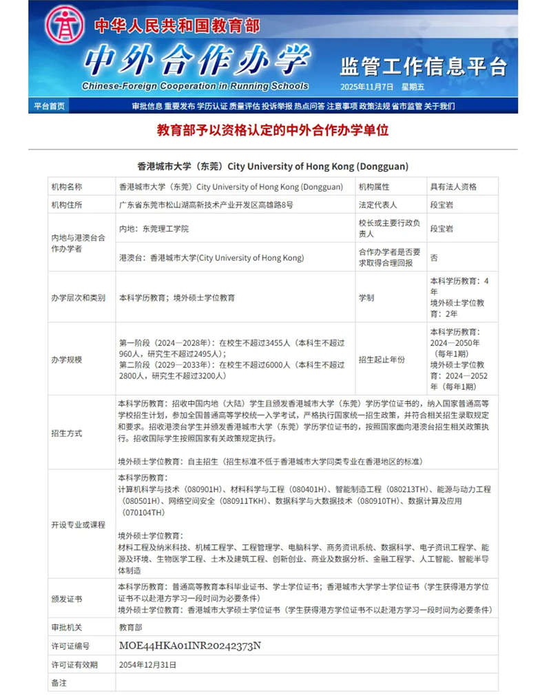 11月7日,香港城市大学(东莞)正式获教育部批复增设3个本科专业和5个硕士专业。本次获批的专业紧扣国家重点产业发展与人才战略需求,标志着学校在学科建设与高层次人才培养体系上迈出关键一步。
