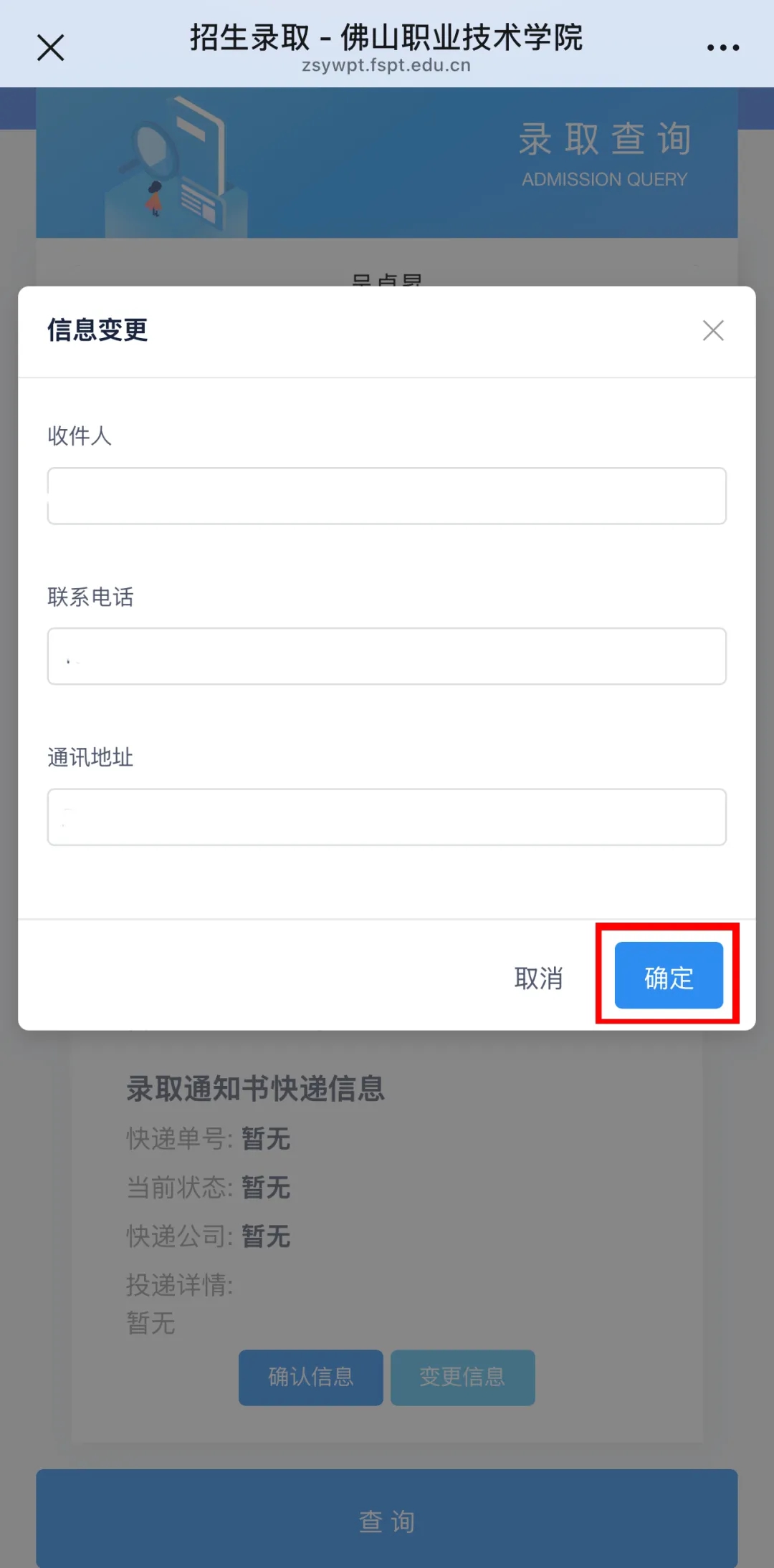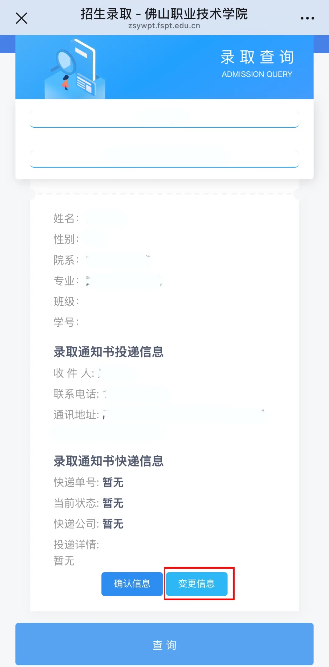 佛山职业技术学院将按照各位考生在2025年高考志愿填报时填写的联系方式邮寄录取通知书。若需修改,请通过关注“佛山职业技术学院”公众号,点击“校园服务—录取查询”,或者是关注“佛职院招生与就业指导中心”公众号,点击“招生服务—录取查询”,输入考生姓名和身份证号进入查询结果界面;然后点击“信息变更”,输入正确的收件人、联系电话和通讯地址,最后“确定”即可修改。修改时间截止至8月8日中午12:00。