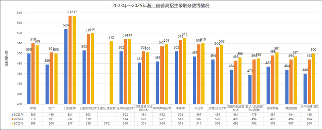 此外,浙江省内单考单招所有专业录取分数大幅度提升,其中医学护理类最低投档线较2024年提高24分,药学类最低投档线较2024年提高22分,艺术类(工艺美术)类最低投档线较2024年提高27分,学前教育类最低投档线较2024年提高11分。招生专业中6个专业最低投档线较2024年提高30分以上,其中现代家政服务与管理专业最低投档线较2024年提高99分,考生综合素质显著提高。