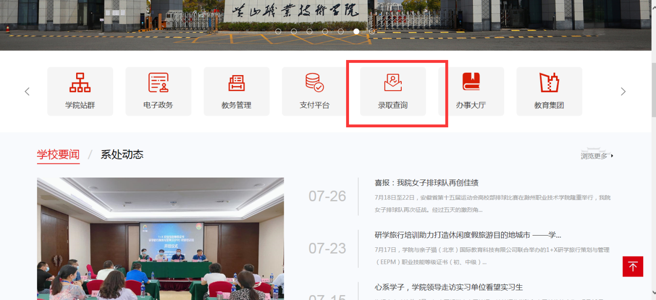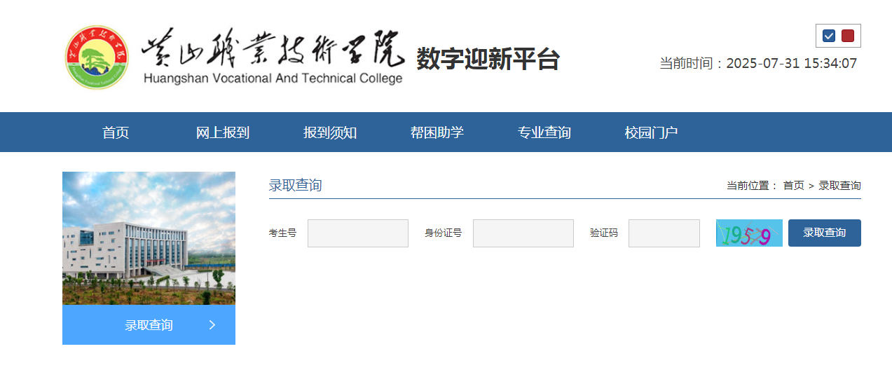 录取查询请大家登录黄山职业技术学院官网首页,点击录取查询,如下图所示: