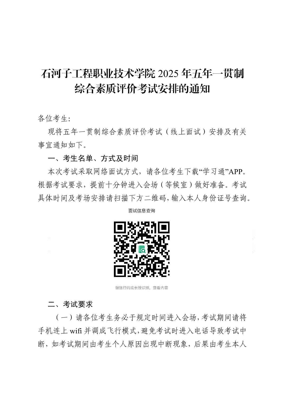 石河子工程职业技术学院2025年五年一贯制综合素质评价考试安排的通知