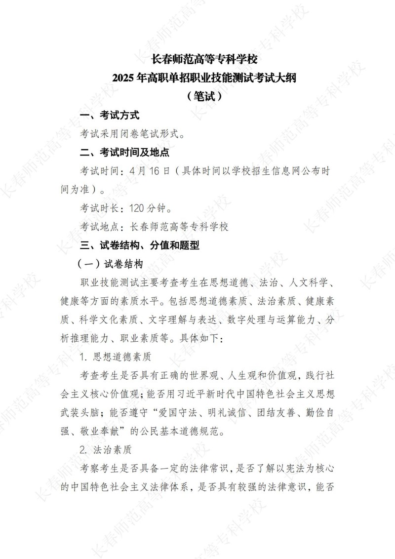 长春师范高等专科学校2025年高职单招职业技能测试考试大纲