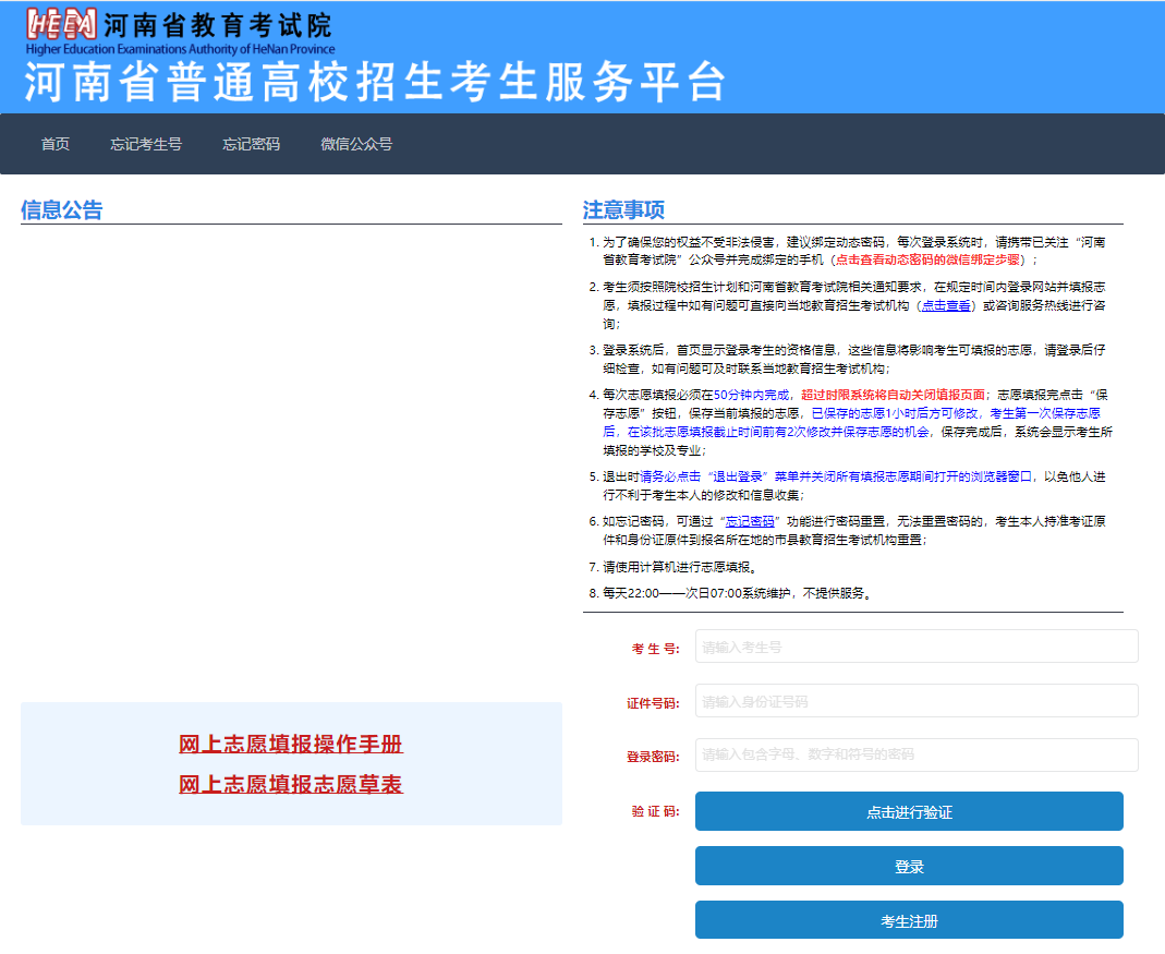 网上填报。考生需要在8月19日09:00-20日18:00,登录河南省教育考试院网站(http://www.haeea.cn),查阅相关信息,凭本人账号和密码登录“河南省普通高校招生考生服务平台”(https://pzwb.haeea.cn)查看本人档案运转状态,进入填报志愿界面,按照规定程序和时间,完成网上志愿填报。逾期网上填报系统关闭,考生将无法再进行任何操作。