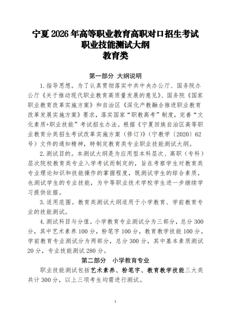 宁夏2026年高等职业教育高职对口招生考试职业技能测试大纲(教育类)