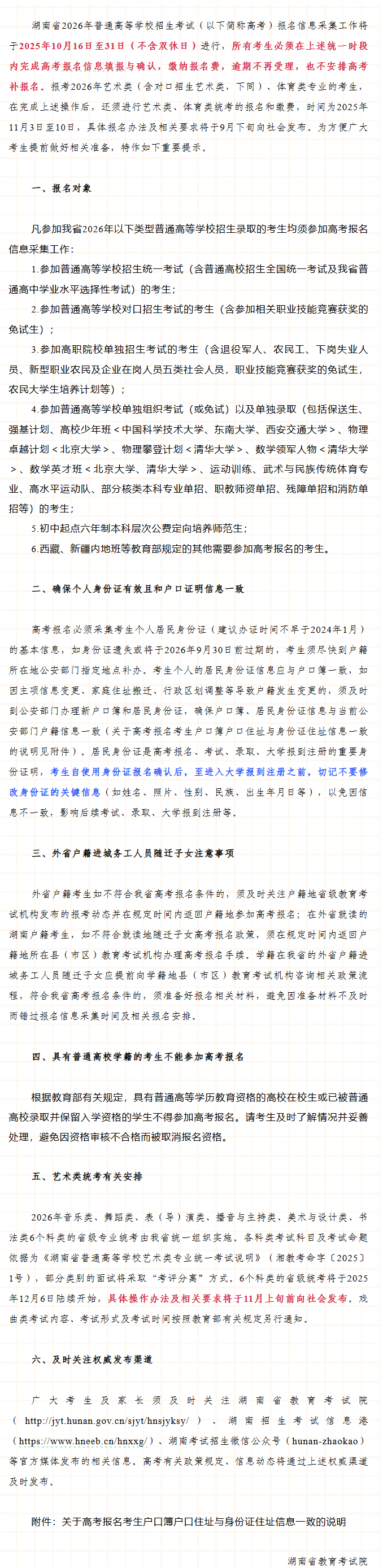 《湖南省2026年普通高等学校招生考试报名和艺术类统考重要提示》-10月16-31日进行湖南省2026年高考报名!