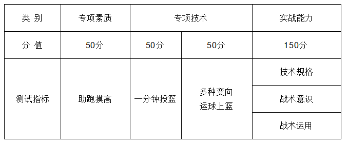 (1)篮球项目测试指标与所占分值(男女篮测试内容)