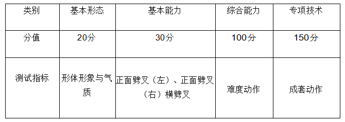 (一)舞蹈表演专业(含:艺术舞、国际标准舞。基本功考试100分,剧目表演200分,总分300分。)