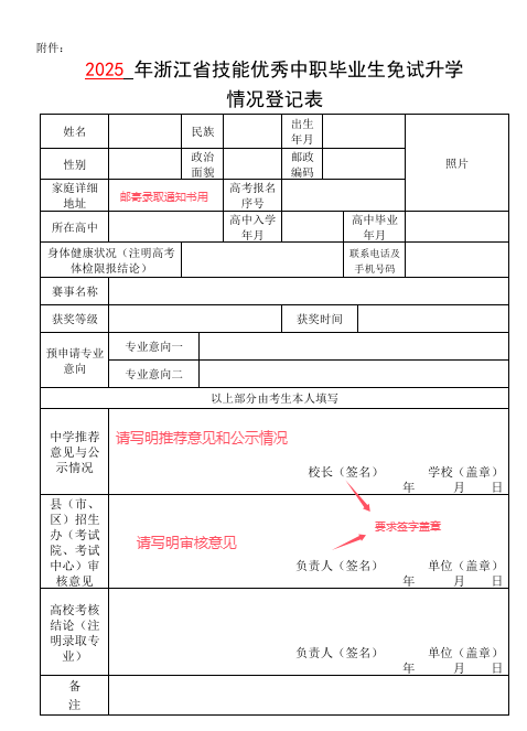 (1)经中学及当地招生办(考试院、考试中心)审核并盖章的《浙江省技能优秀中职毕业生免试升学情况登记表》;