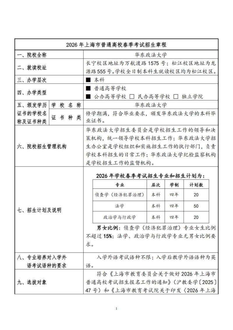 1、2024年华东政法大学全国统考招生章程