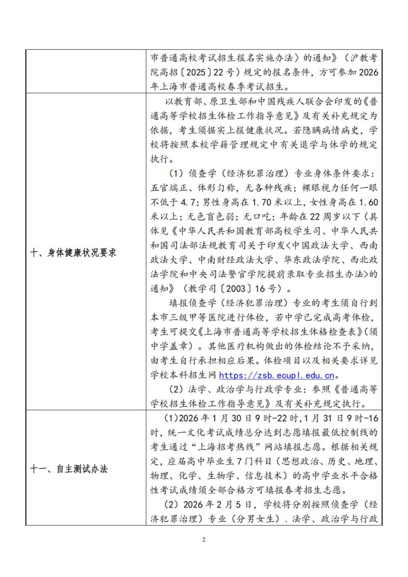 华东政法大学2026年春季高考招生章程