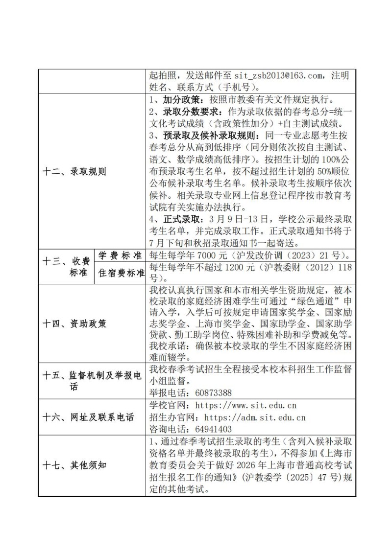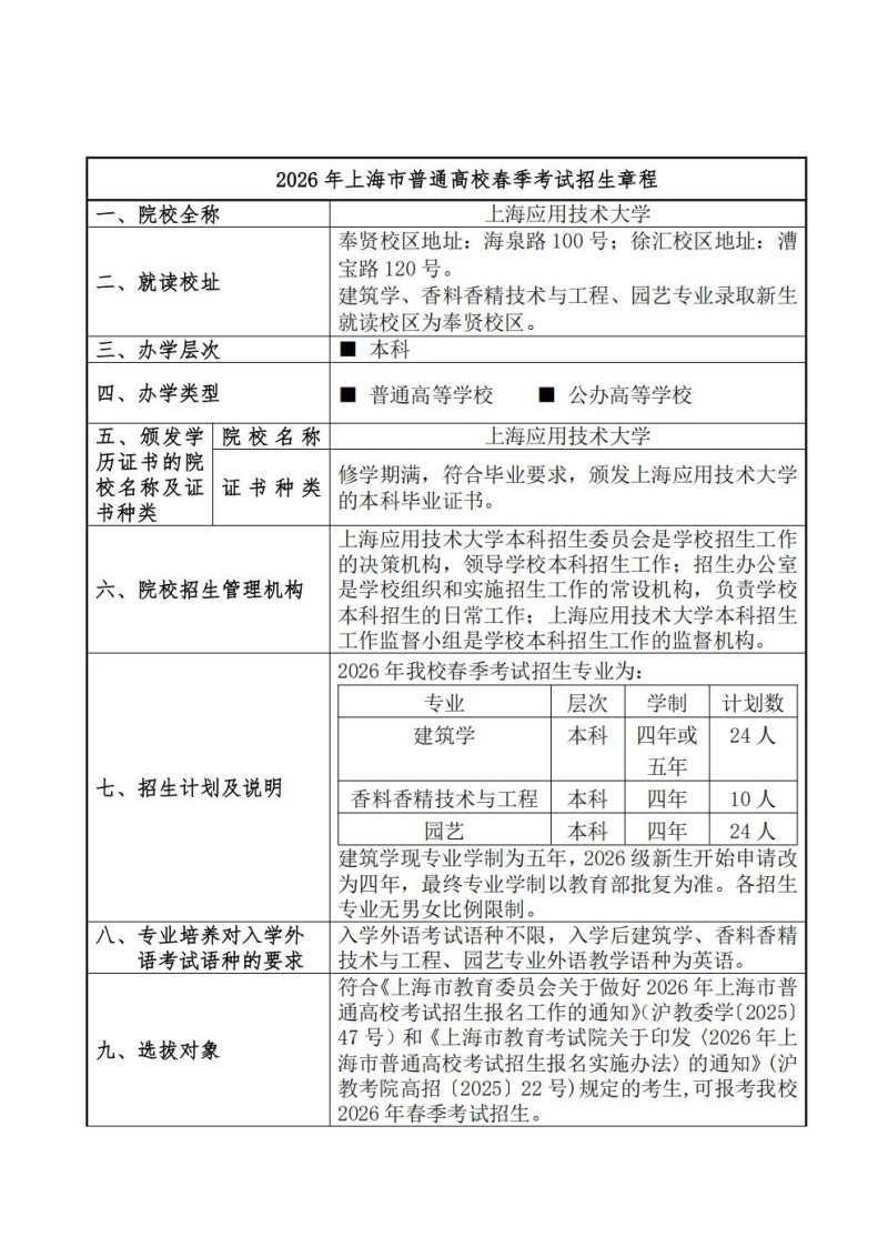 上海应用技术大学2026年春季高考招生章程