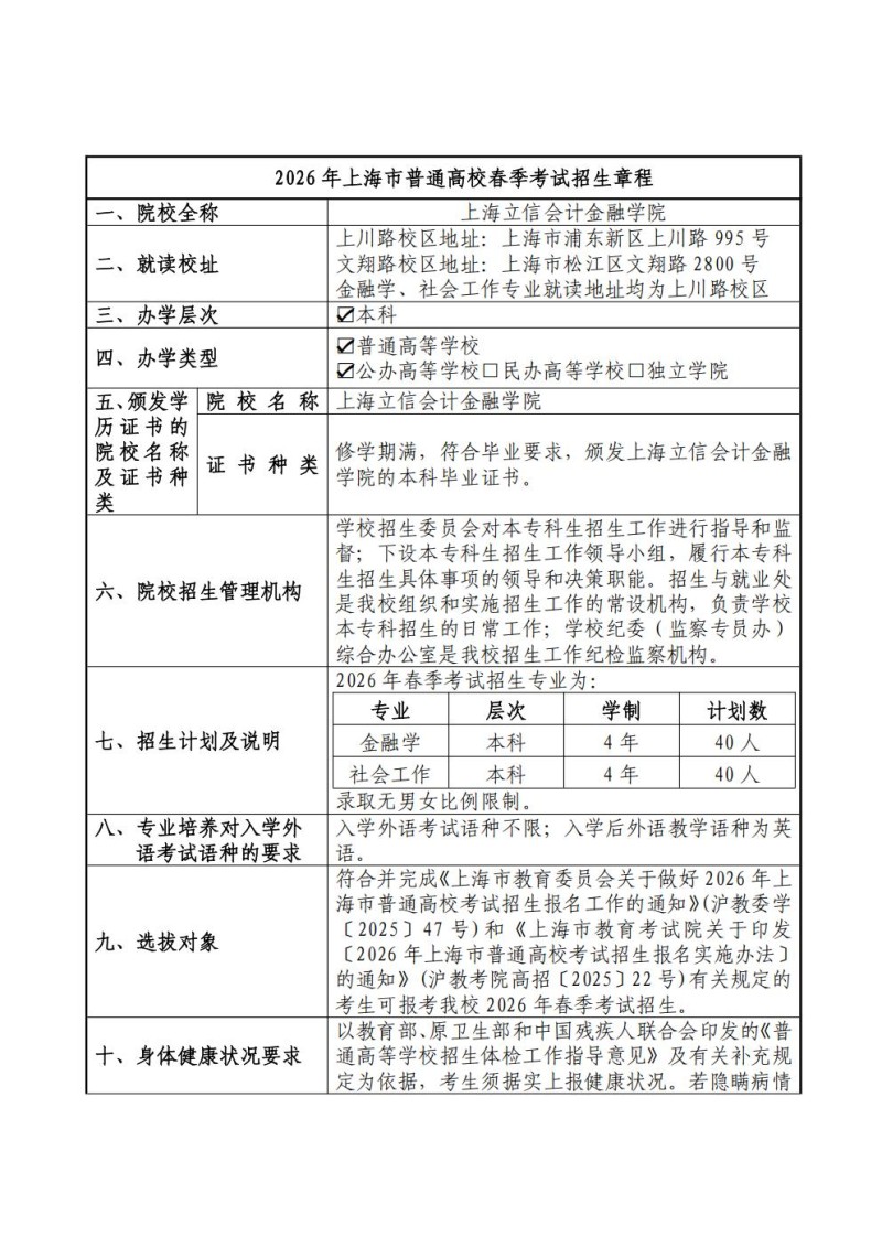 上海立信会计金融学院2026年春季高考招生章程
