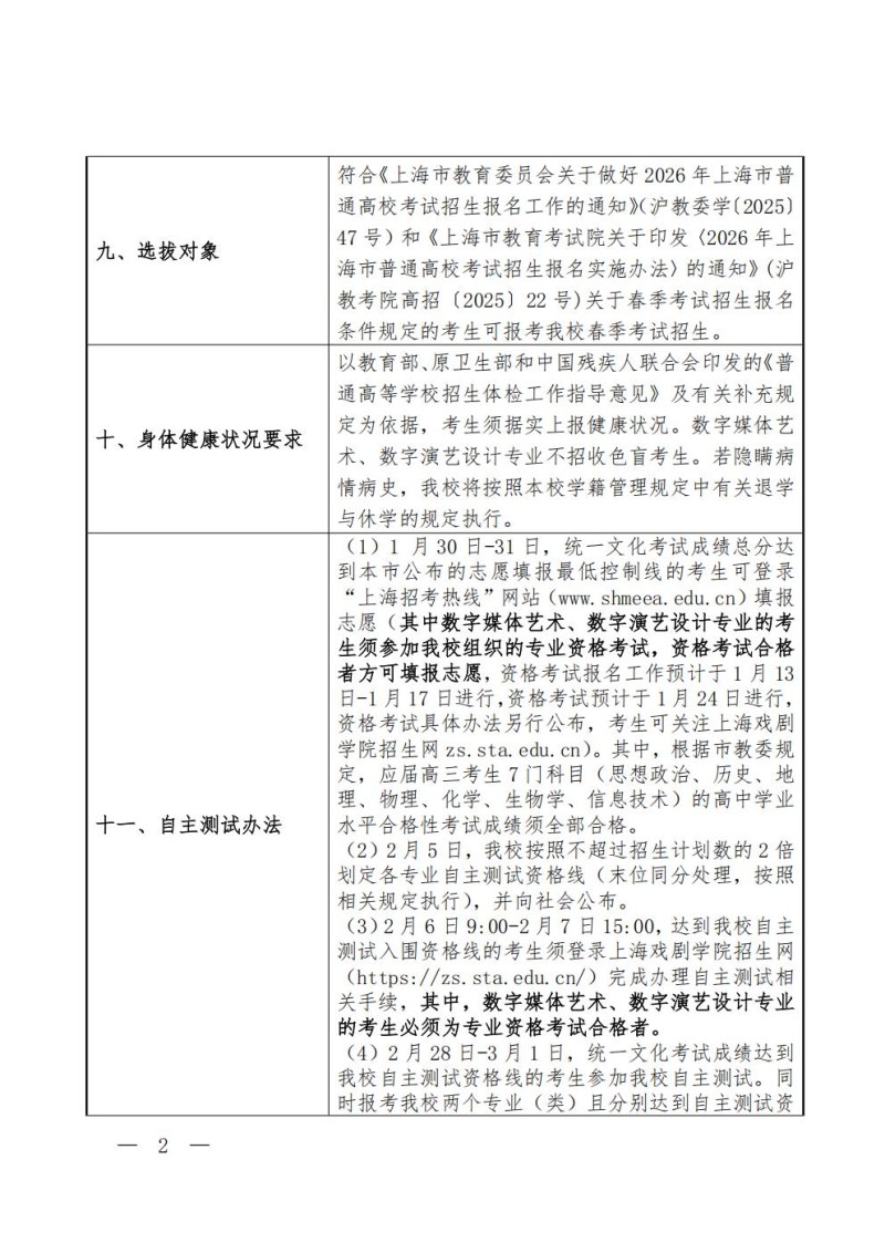 2、上海戏剧学院2026年艺术类校考专业本科招生考试规...
