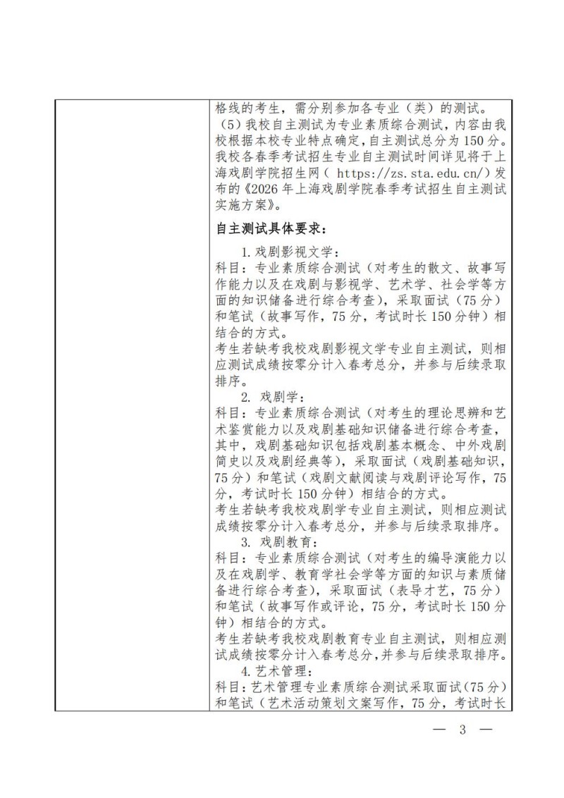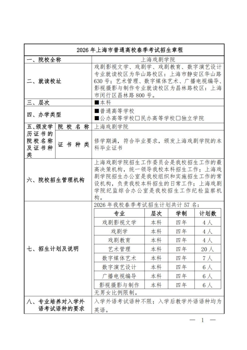 上海戏剧学院2026年春季高考招生章程