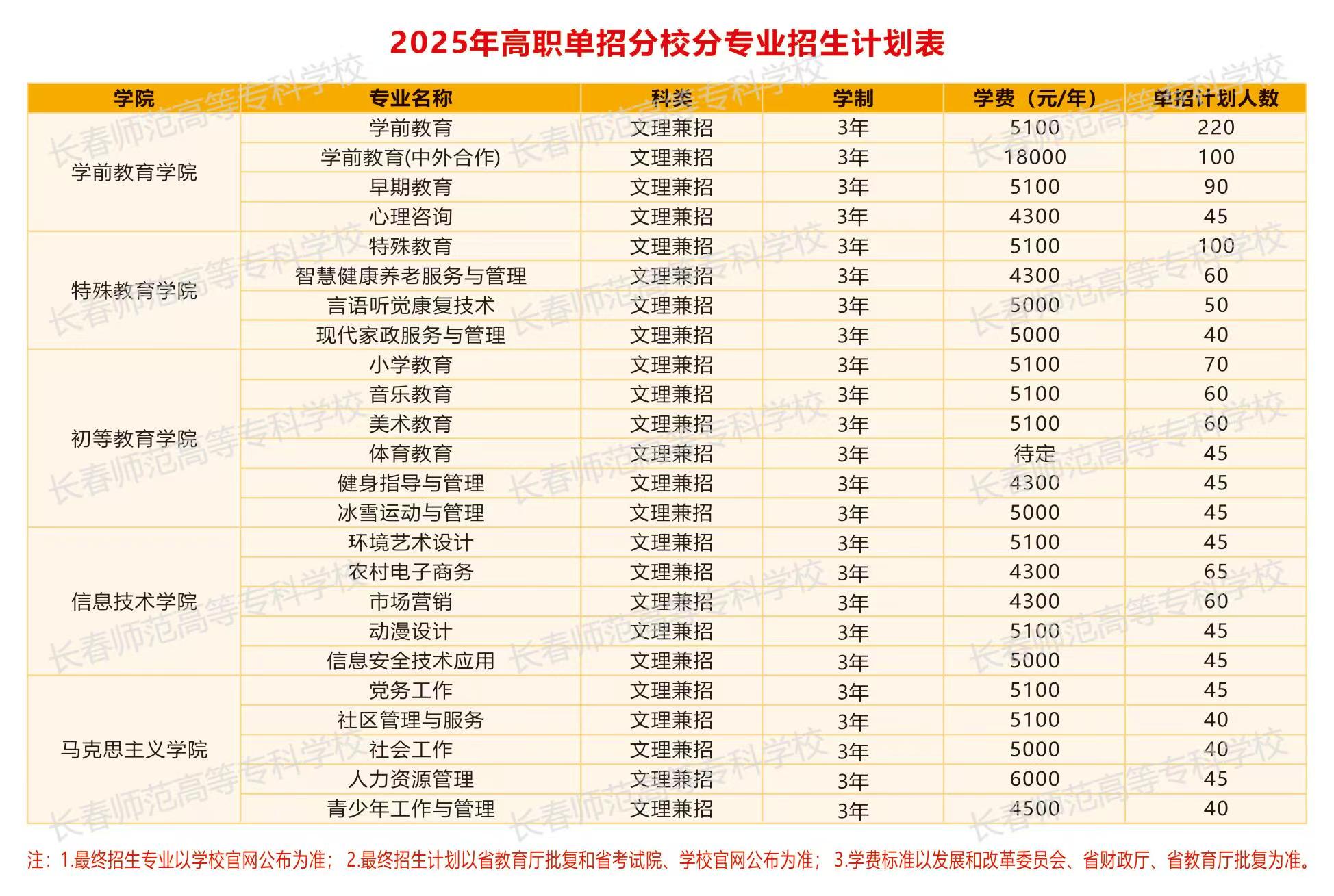长春师范高等专科学校2025年高职单招分校分专业招生计划表