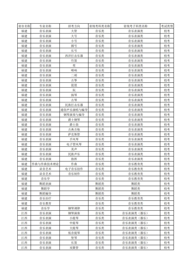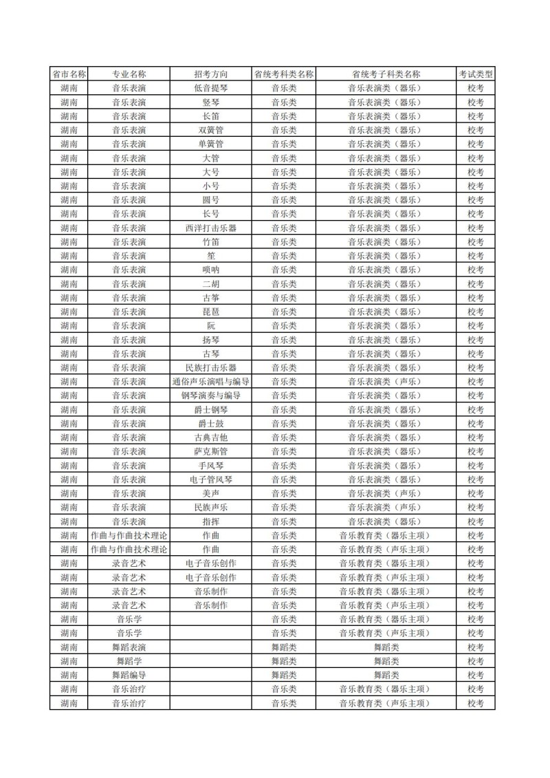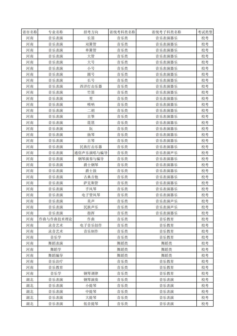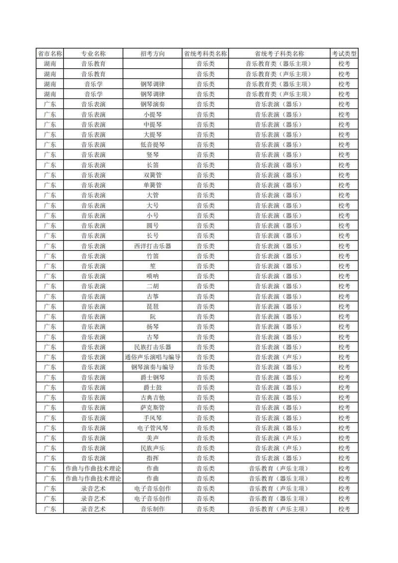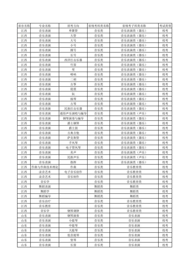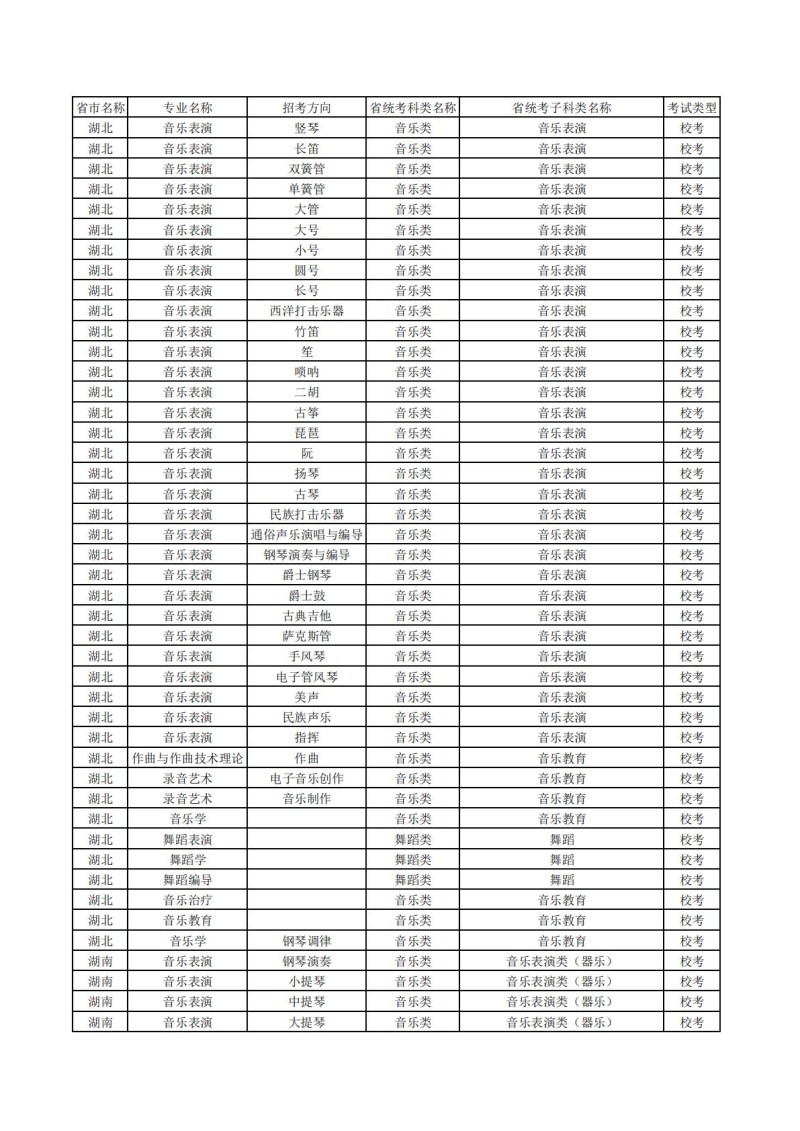 武汉音乐学院2026年普通本科校考招生专业和各省(市、自治区)统考子科类对照表