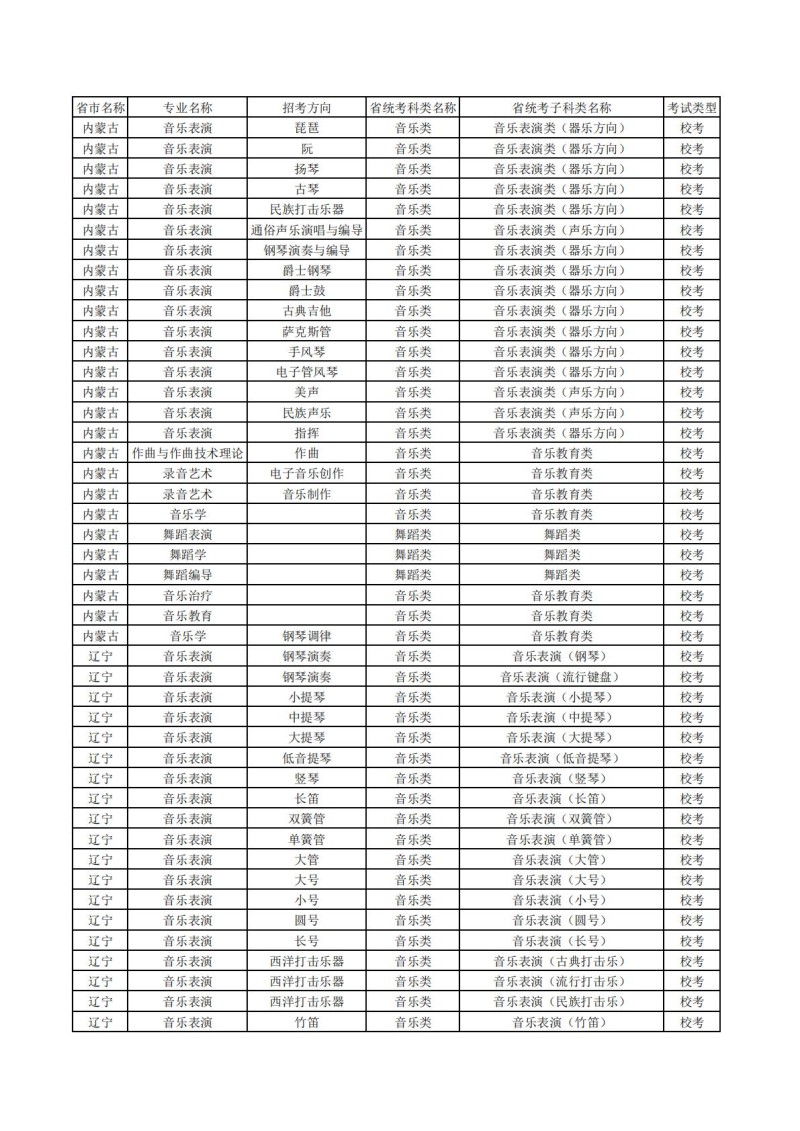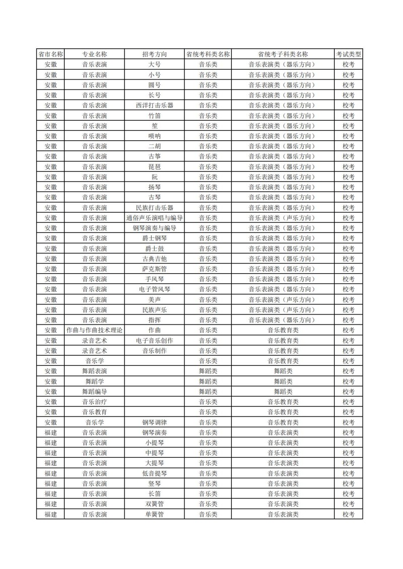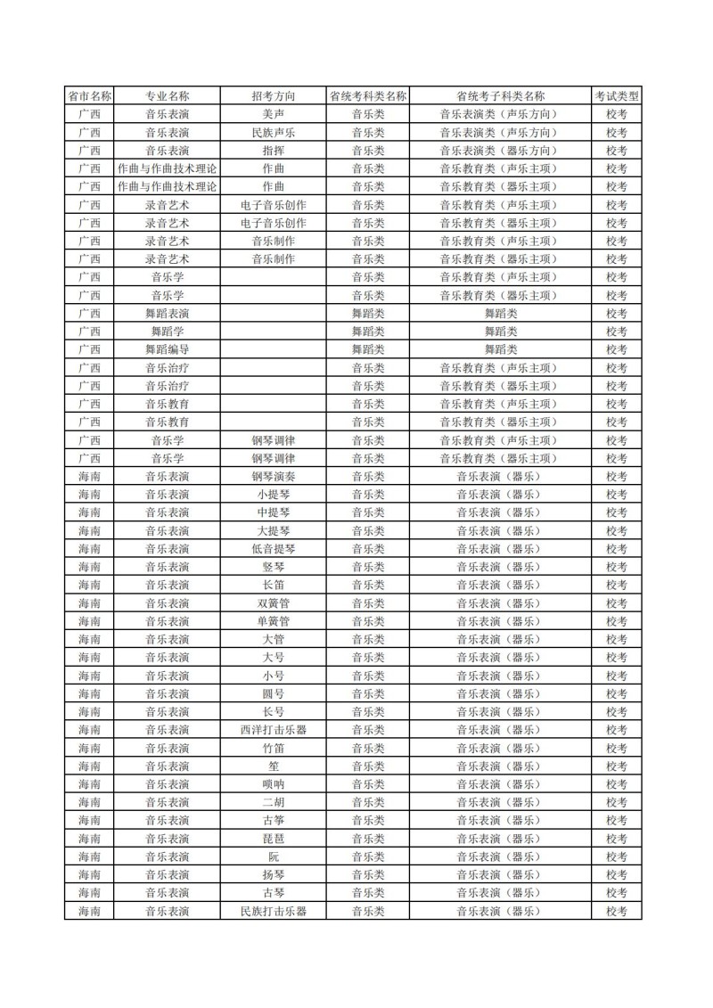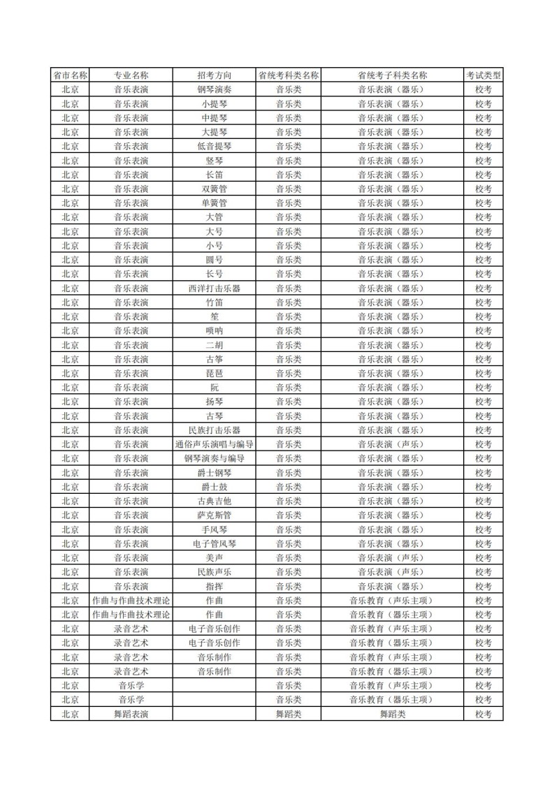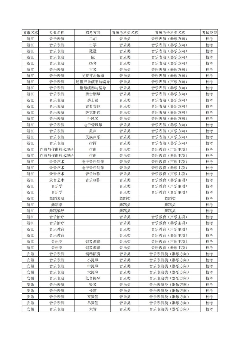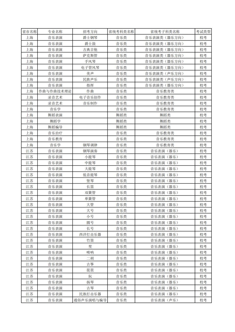 武汉音乐学院2026年普通本科校考招生专业和各省(市、自治区)统考子科类对照表