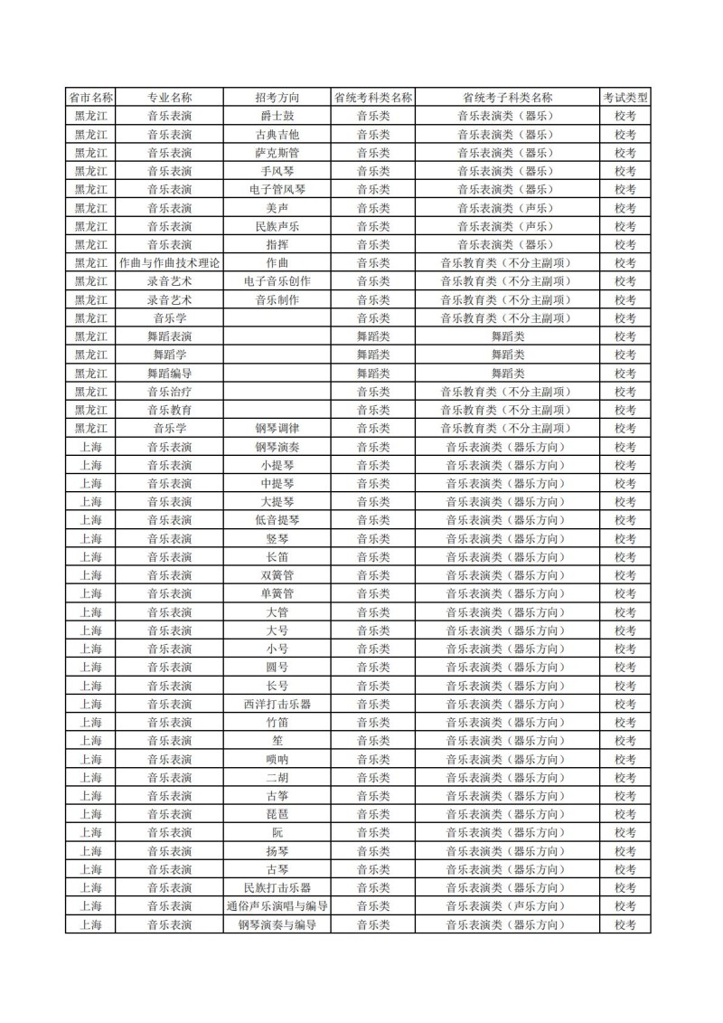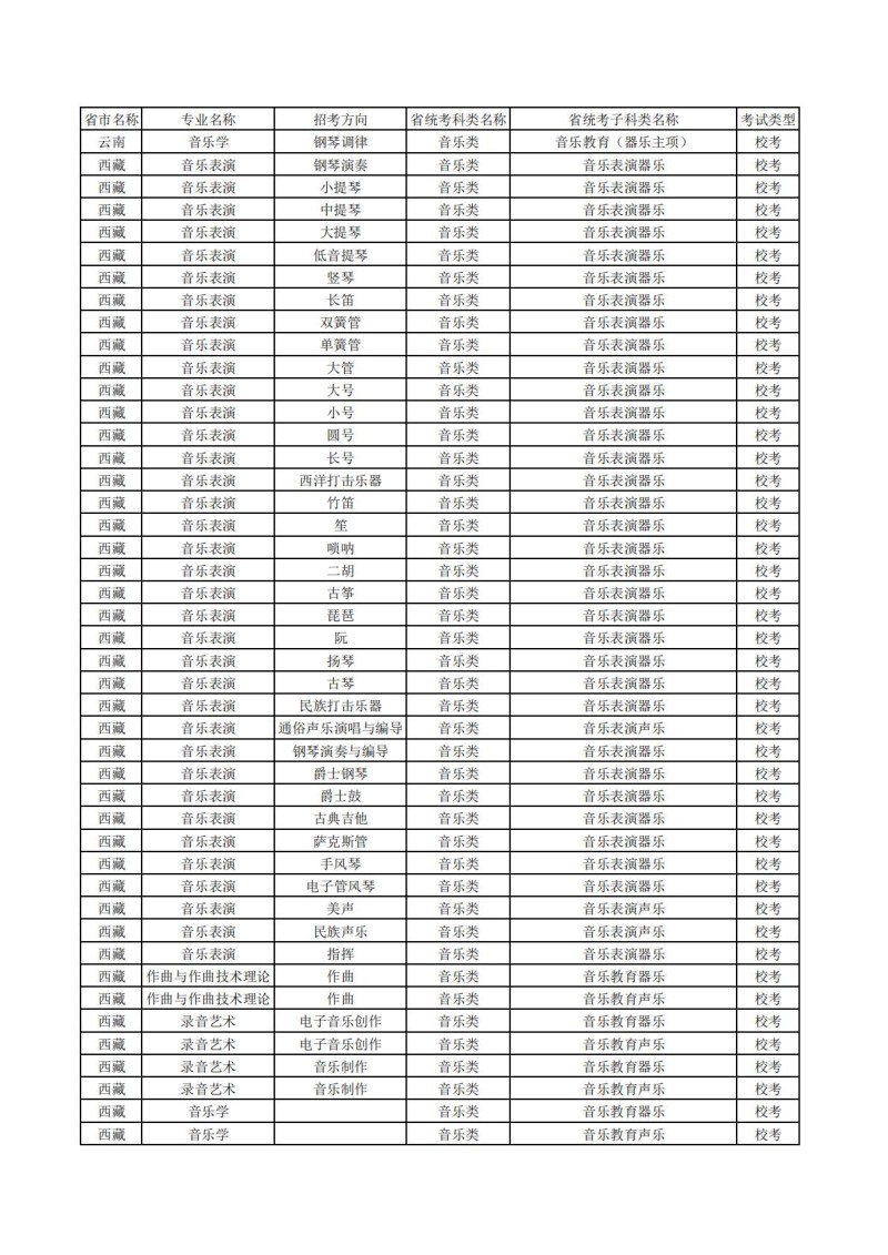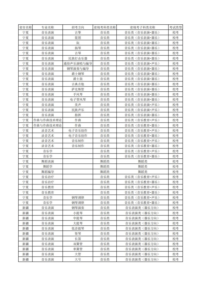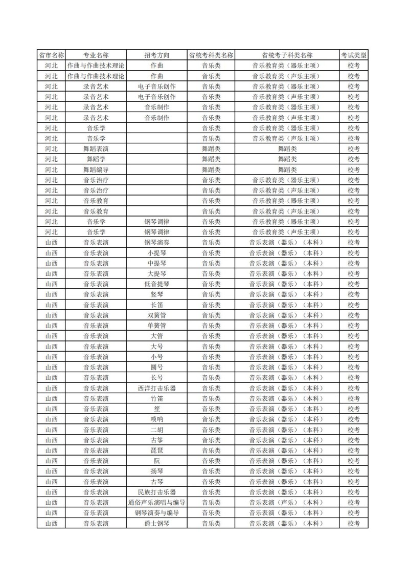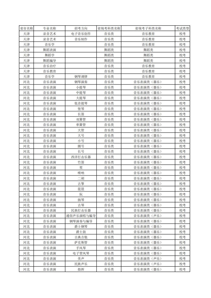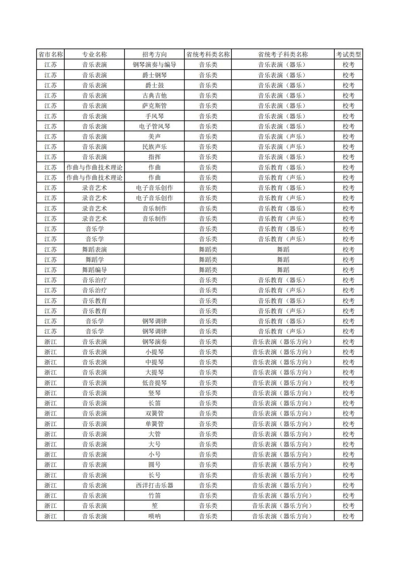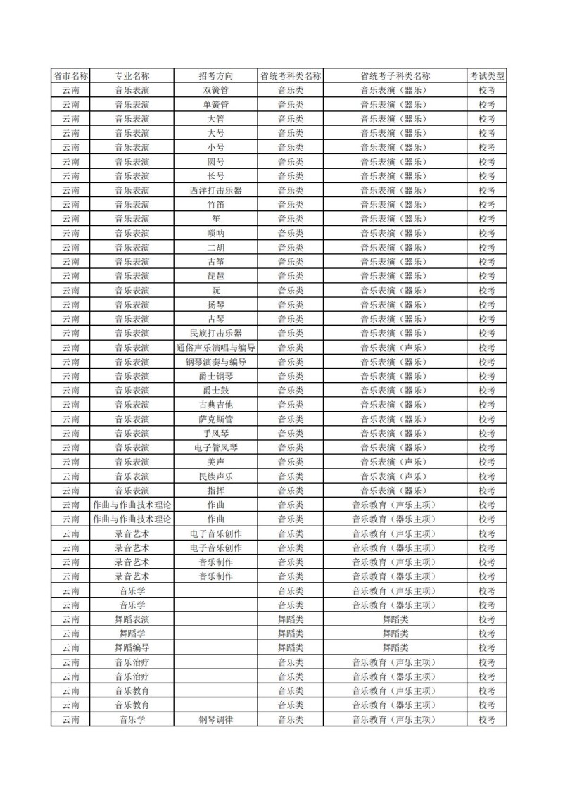 武汉音乐学院2026年普通本科校考招生专业和各省(市、自治区)统考子科类对照表