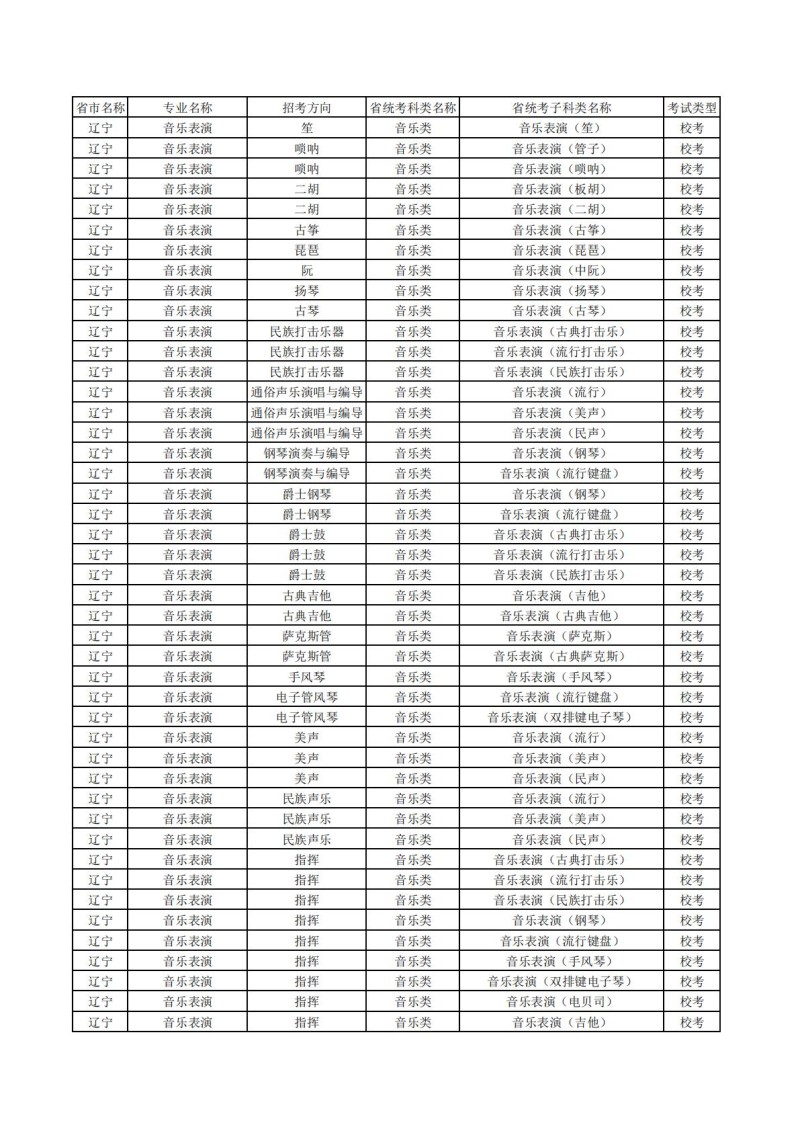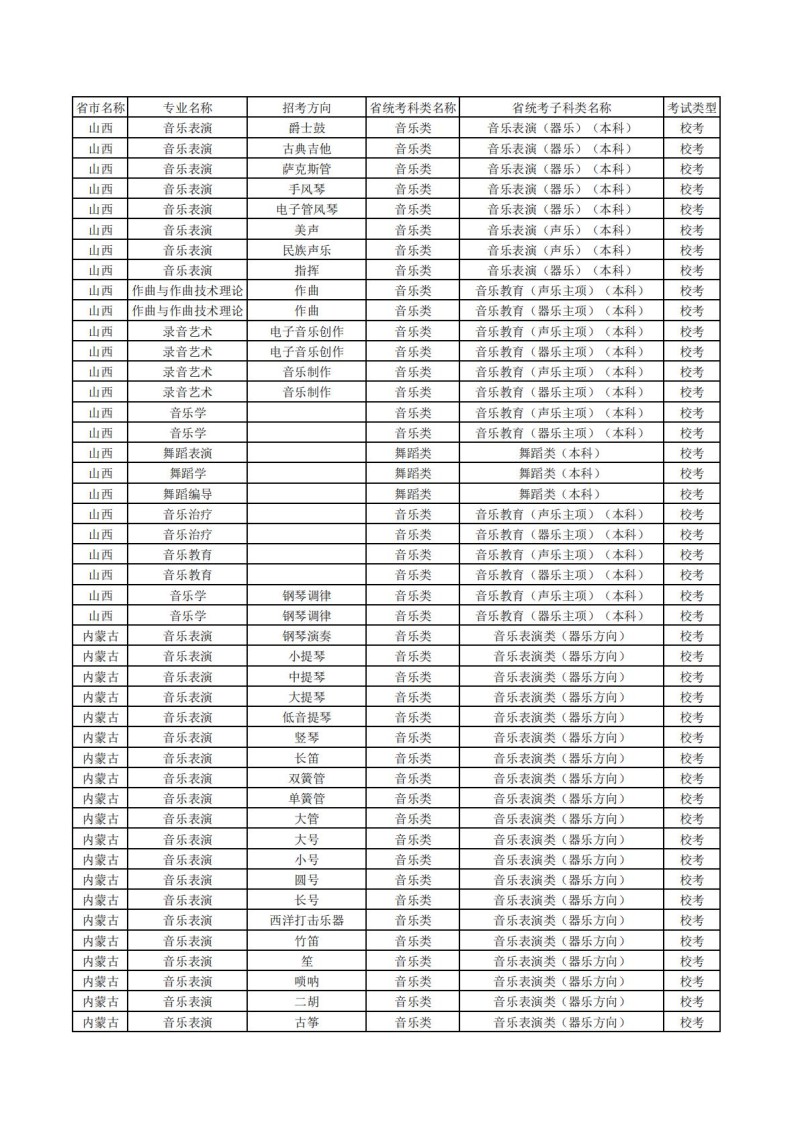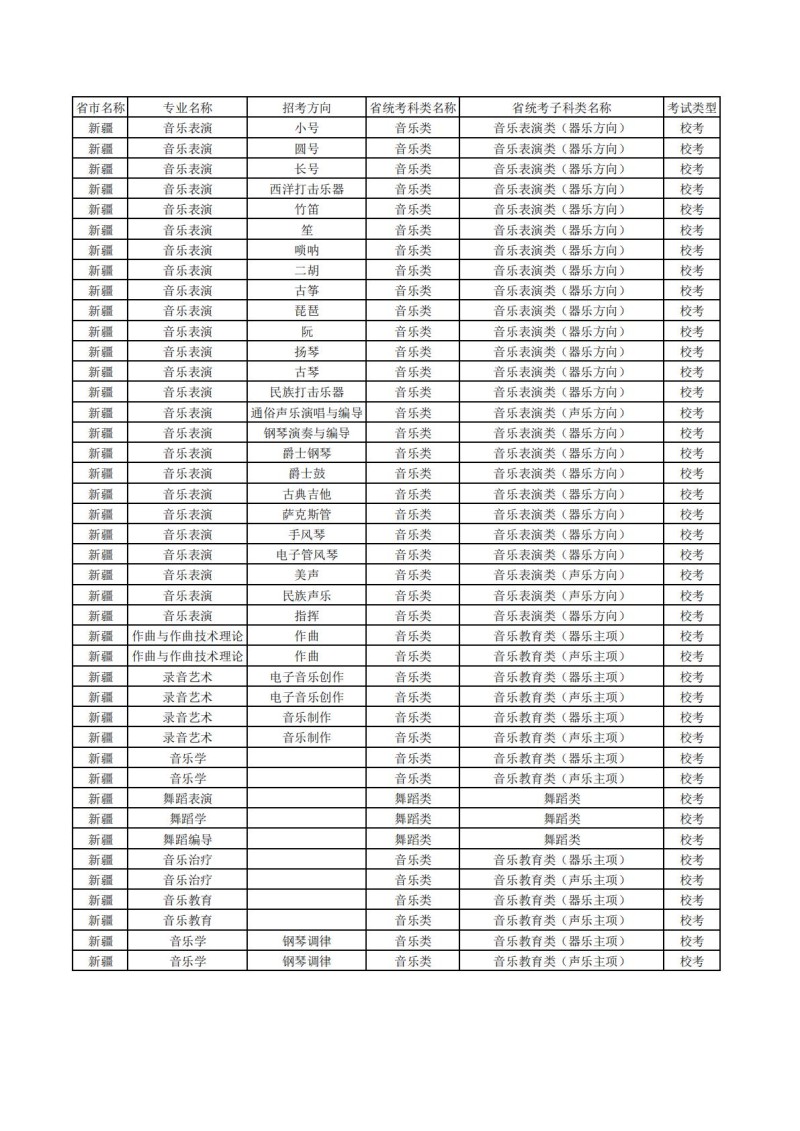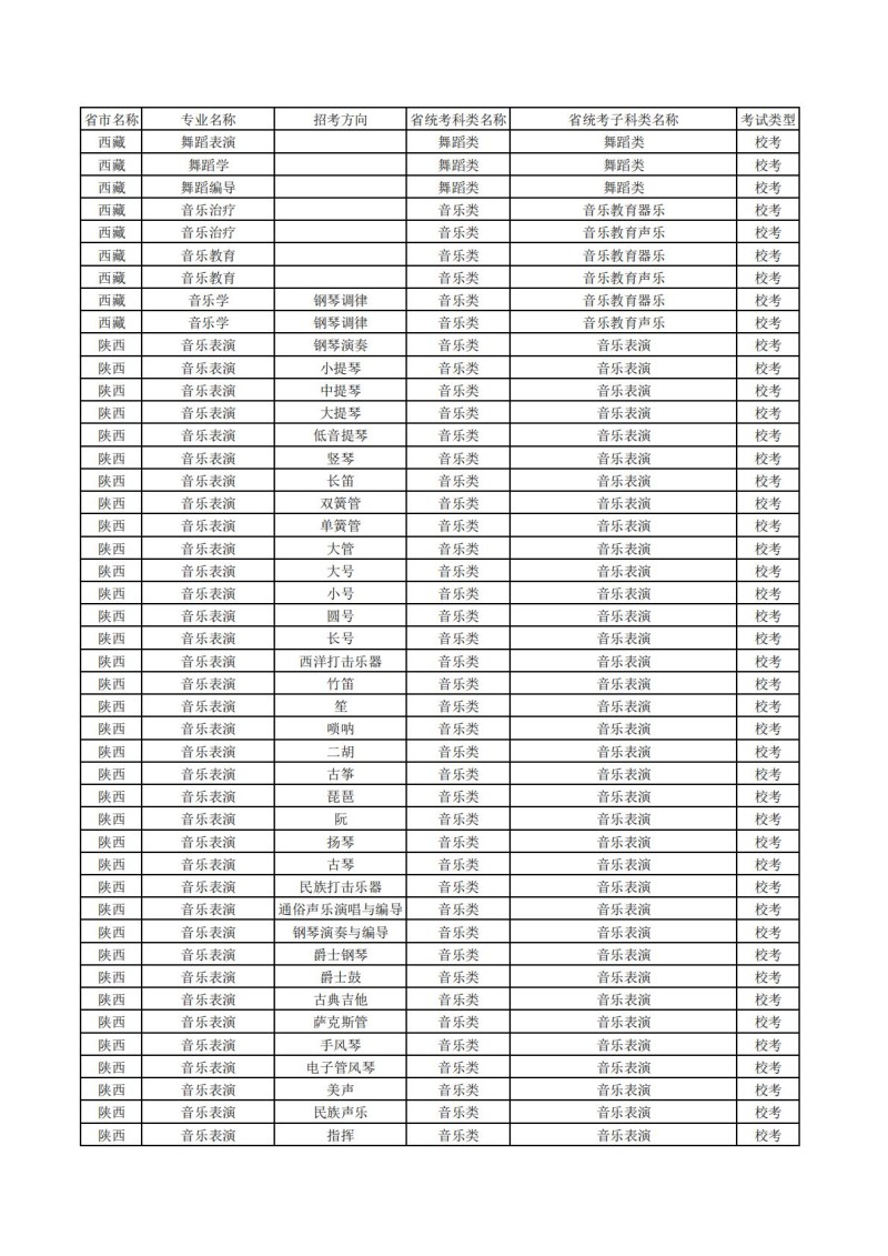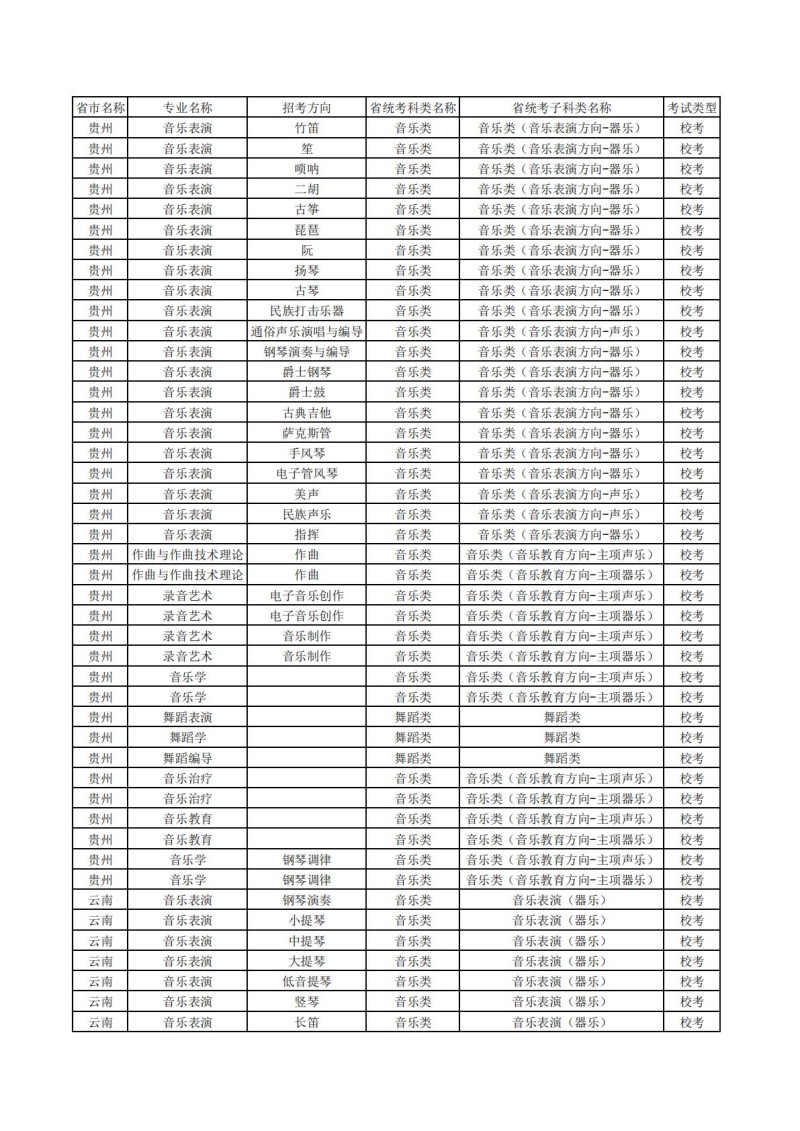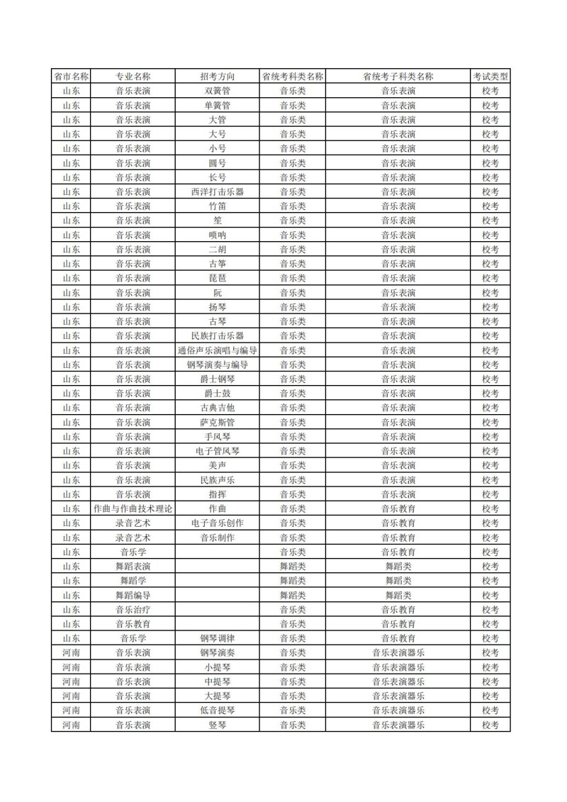 武汉音乐学院2026年普通本科校考招生专业和各省(市、自治区)统考子科类对照表