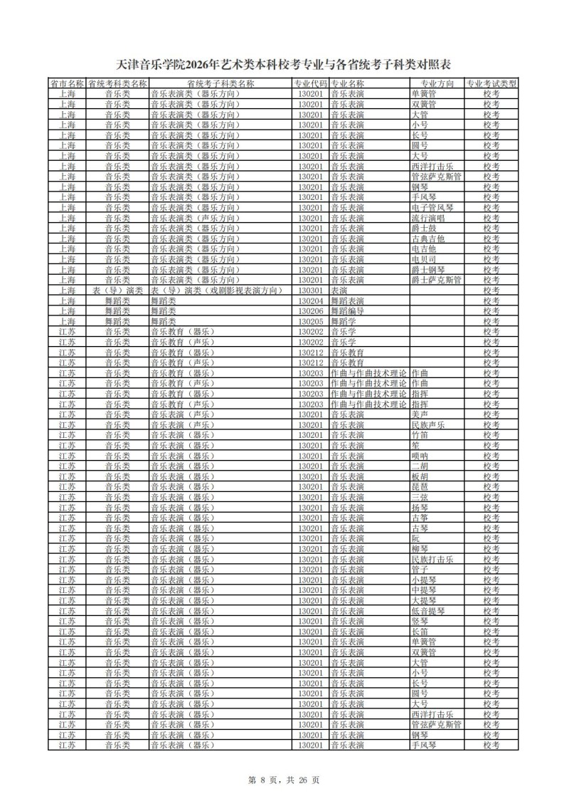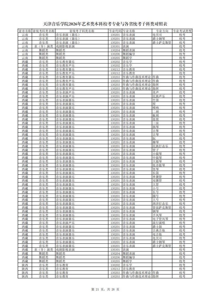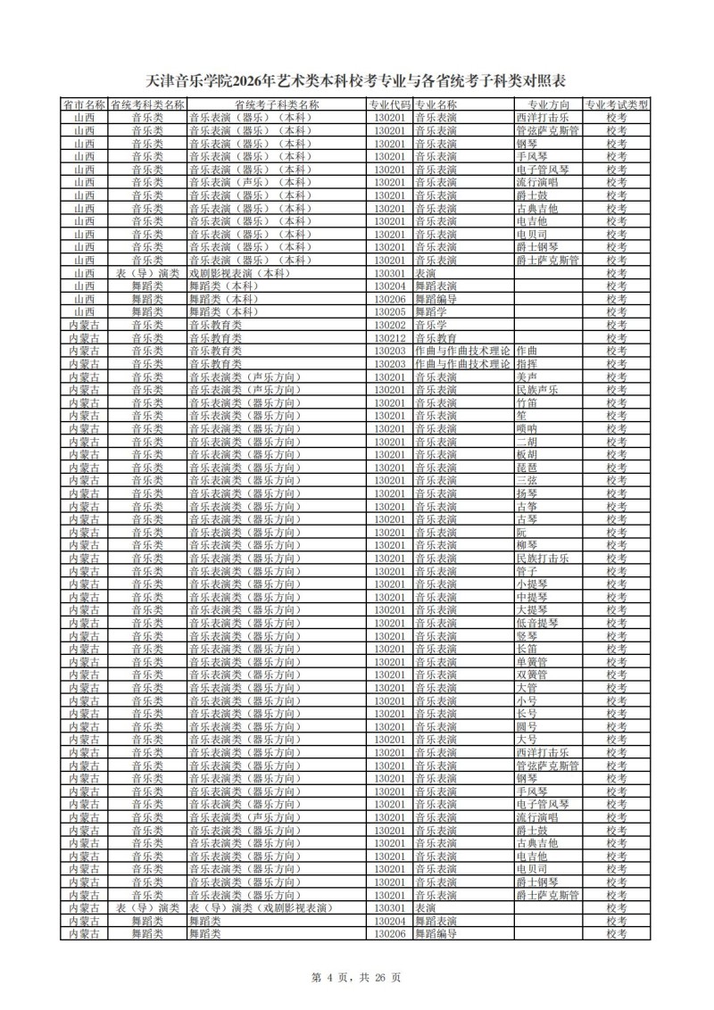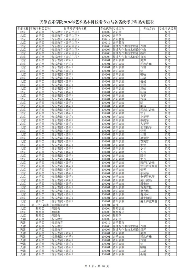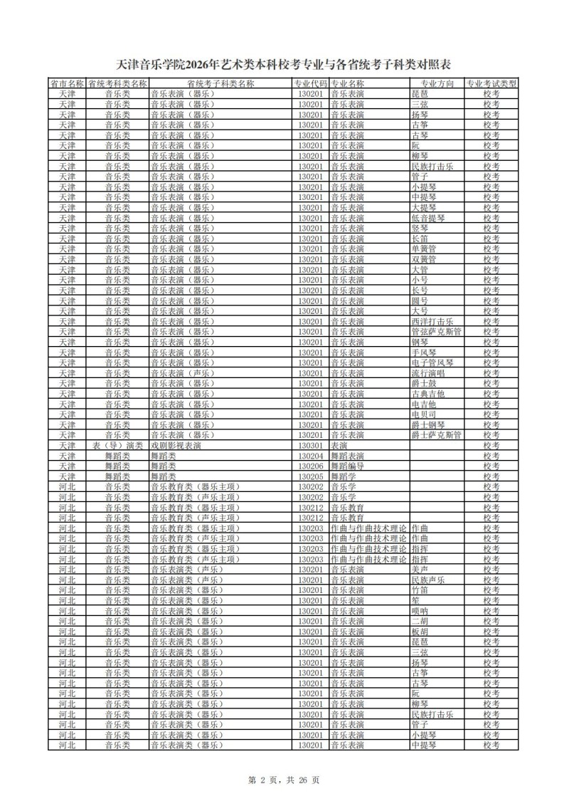 2、天津音乐学院2026年艺术类本科非校考专业与各省统...