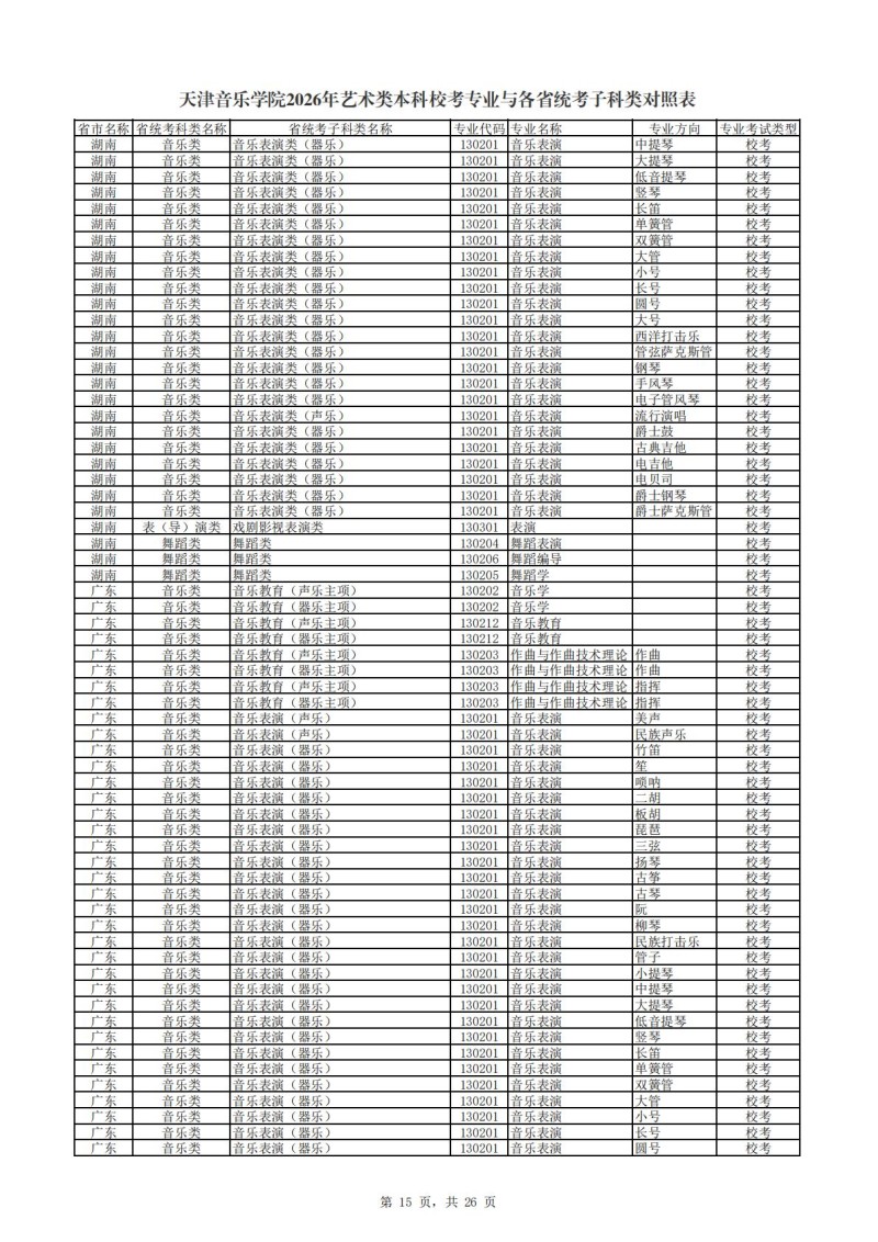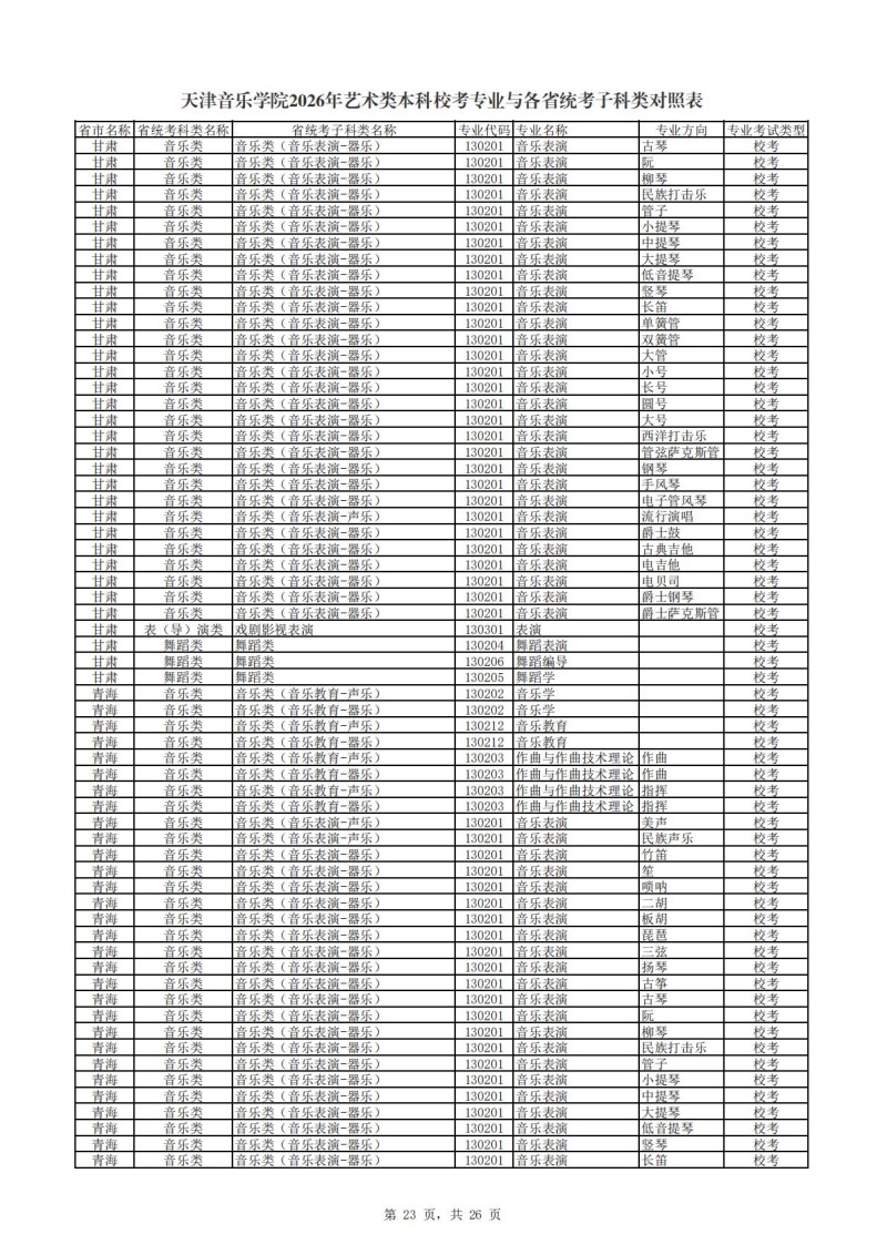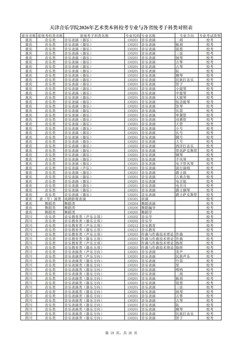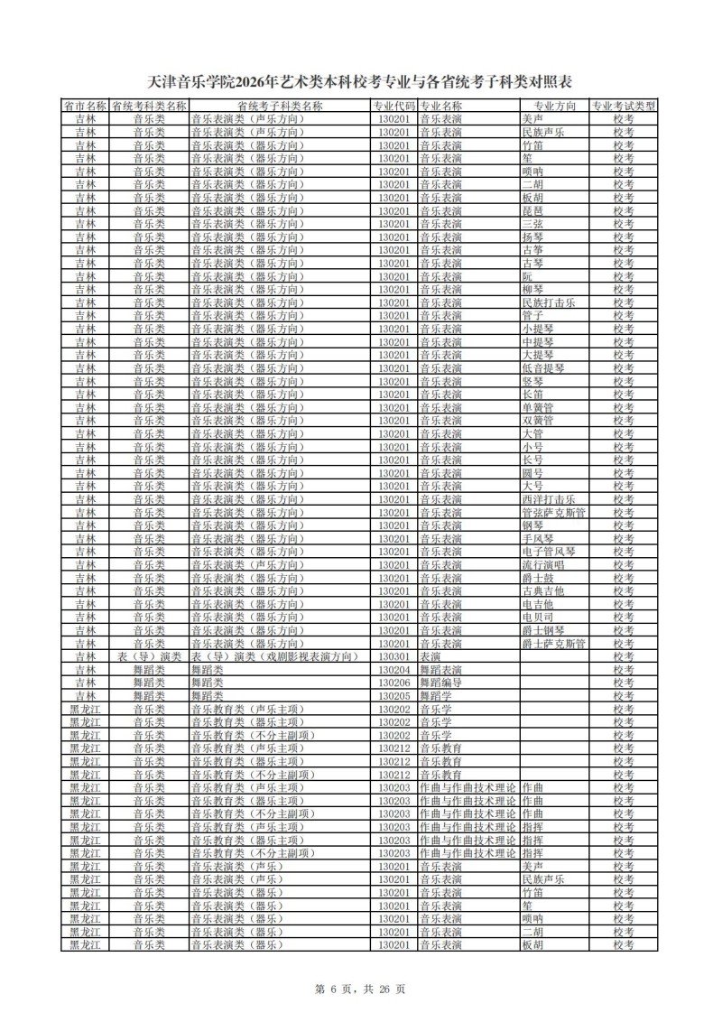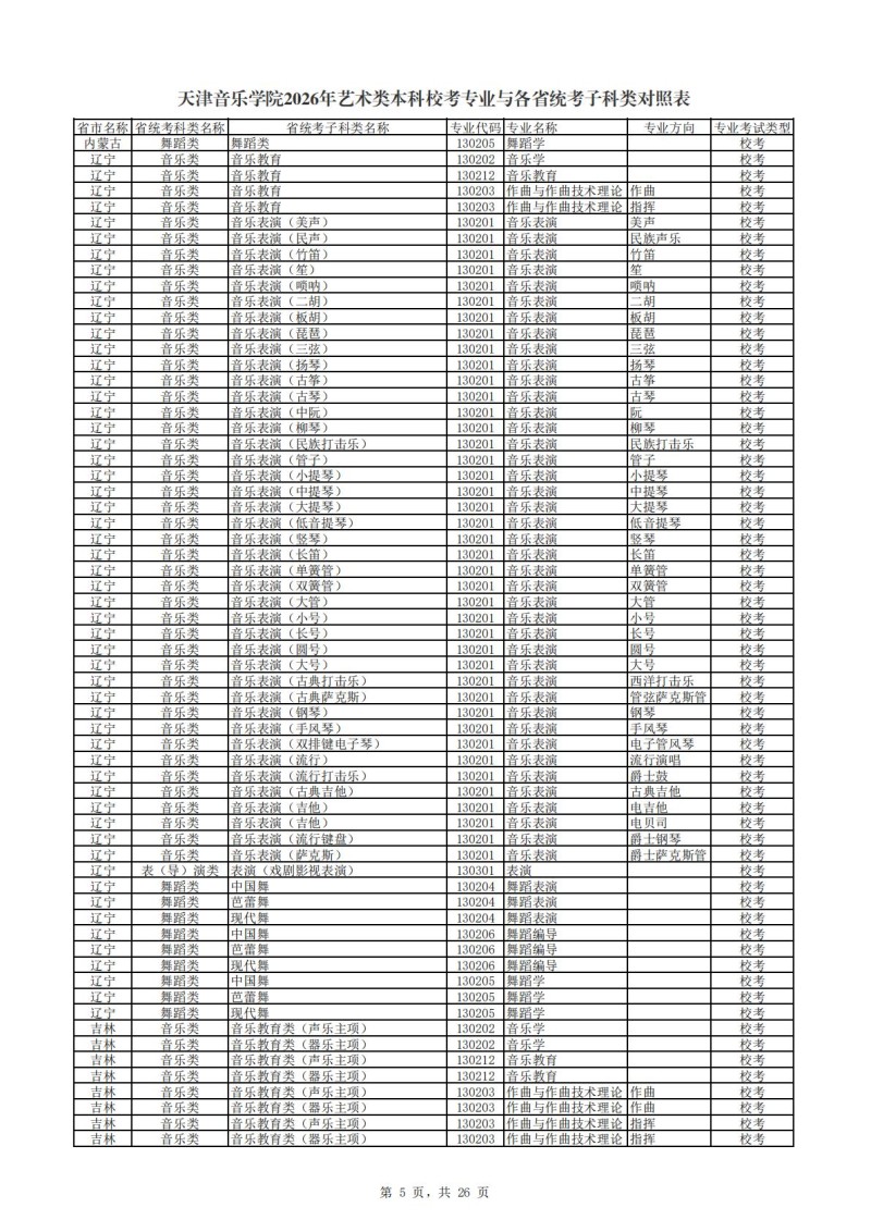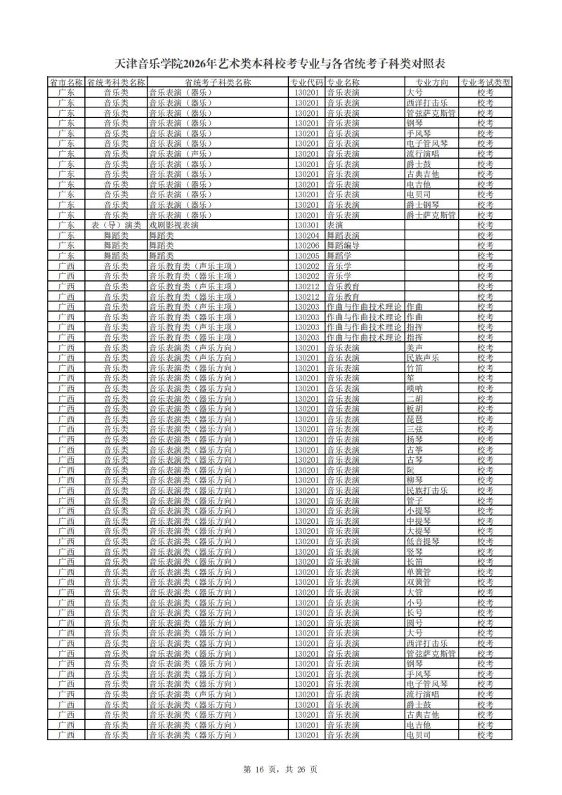 2、天津音乐学院2026年艺术类本科非校考专业与各省统...