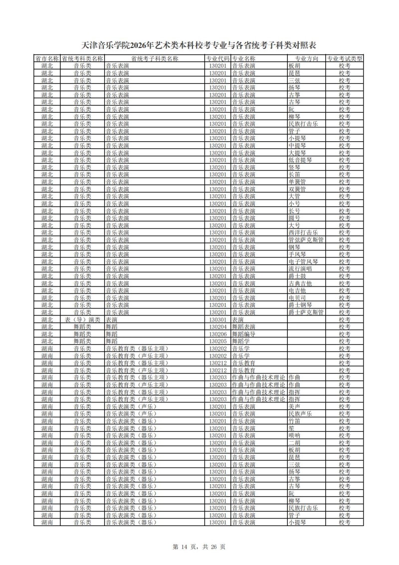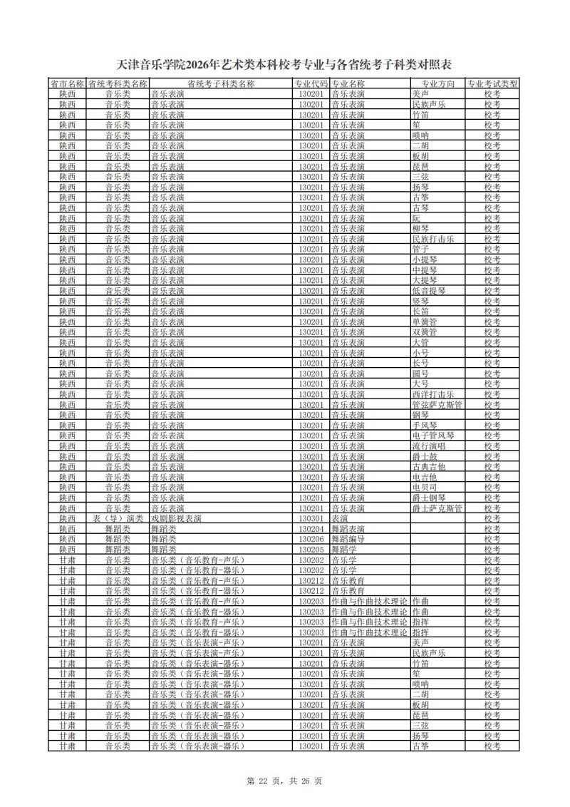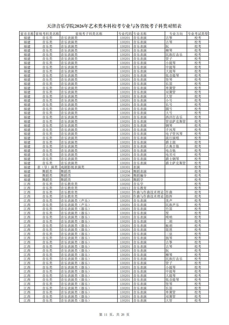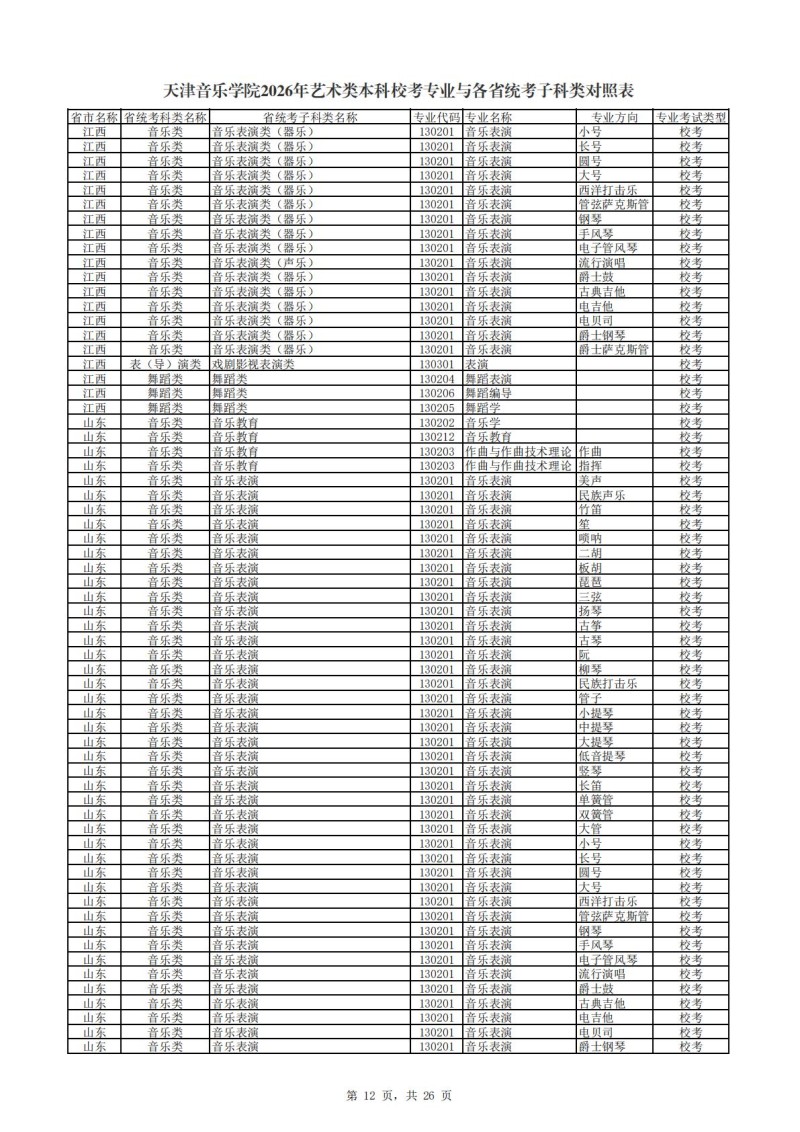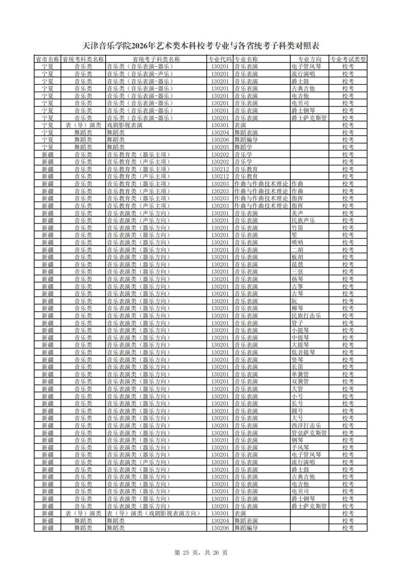 天津音乐学院2026年艺术类本科校考专业与各省统考子科类对照表