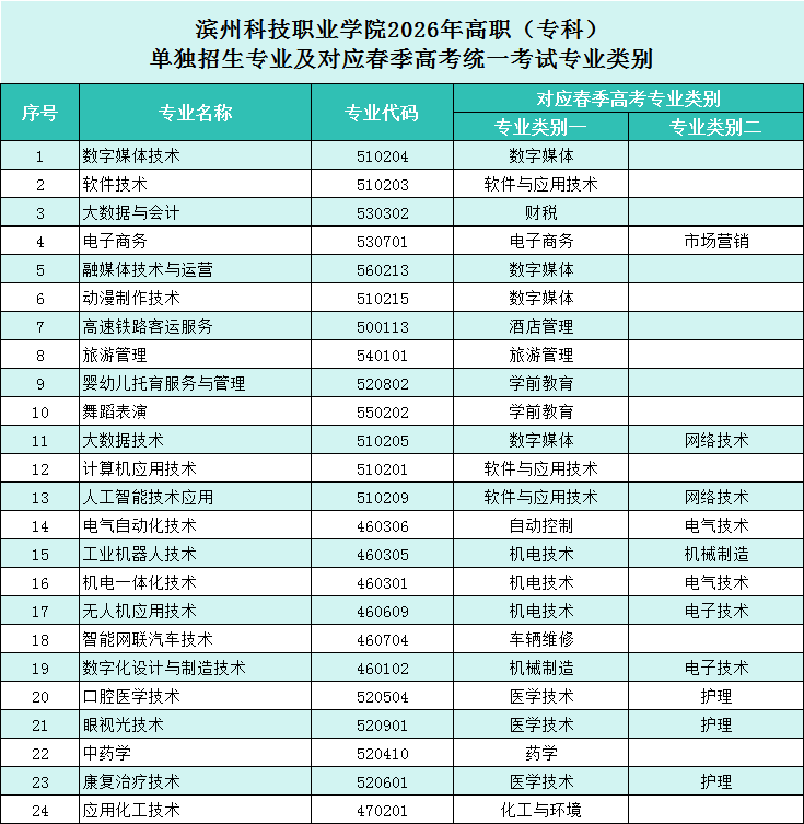 滨州科技职业学院2026年高职(专科)单独招生专业及对应春季高考统一考试专业类别