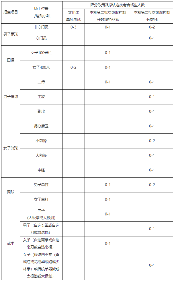 (2)高水平运动队招生计划及校考合格生人数按教育部规定执行,学校可依据生源情况调整各招生项目合格生认定人数,宁缺毋滥。