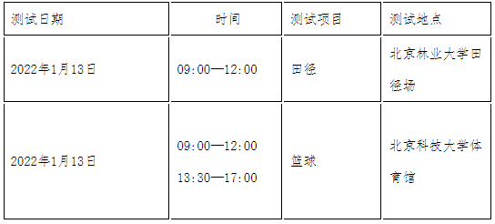 1.时间:田径项目考生资格复审时间为2022年1月12日上午9:00~11:30、下午13:30~17:00;篮球项目考生资格复审时间为2022年1月12日下午13:30~17:30。逾期不予复审。