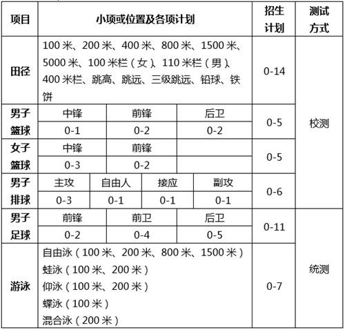 注:男子篮球、女子篮球不招收曾是或目前仍属国家、省、自治区、直辖市、特别行政区运动队正式在编运动员;不招收在篮球运动管理中心注册及曾参加过全国青年联赛、俱乐部青年联赛、NBL联赛、CBA联赛、WCBA联赛的运动员。